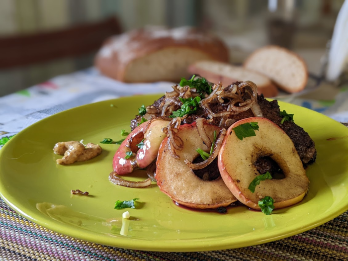 Сервируем с капелькой баварской горчицы и петрушкой, выкладывая яблоко и лук на кусочек печени. Это очень вкусно! ))