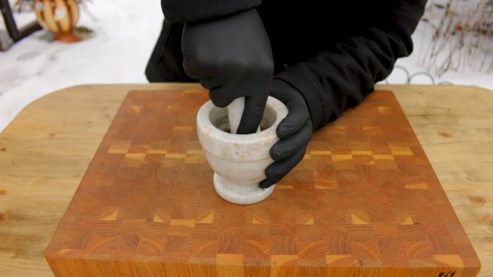 Начинаем с приготовления маринада. В ступку помещаем 2 ч.л перца черного горошком и 2 ч.л. кориандра. Добавляем листья с нескольких веточек тимьяна. Перетираем специи вместе при помощи пестика. Зубчики чеснока измельчаем произвольно, предварительно придавив их плоской стороной ножа, чтобы они лучше отдавали сокю. Корень имбиря, я взял кусочек весом около 50гр, очищаем от кожуры и нарезаем так же произвольно, как и чеснок.