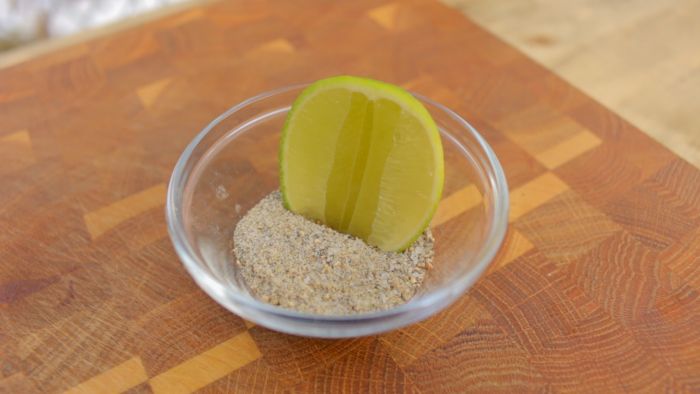 Для приготовления Вьетнамского соуса берем ступку и смешиваем в ней 2 ч.л. черного перца с 2 ч.л. белого перца и 2 ч.л. соли. Перетираем ингредиенты вместе до однородного состояния. Пересыпаем измельченные специи в соусник. У лайма отрезаем нижнюю часть, чтобы он уверенно стоял. Затем отрезаем третью часть плода. И помещаем её в смесь перцев с солью.