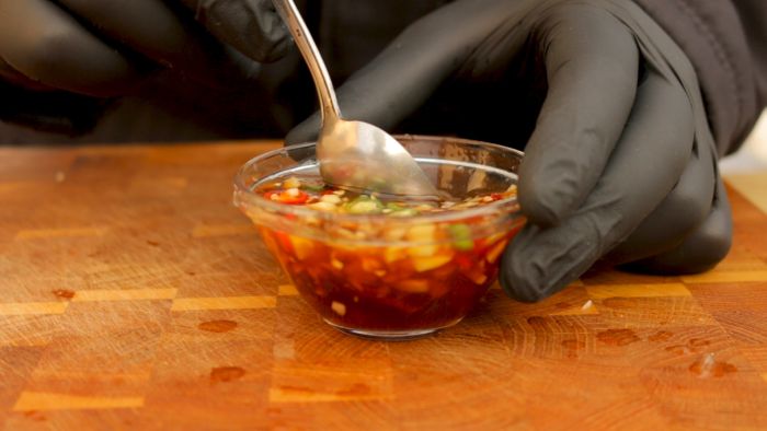 Для приготовления острого рыбного соуса мелко нарезаем 2 зубчика чеснока, предварительно придавив их плоской стороной ножа, чтобы чеснок лучше отдавал сок. Кружками нарезаем 2 острых тайских чили перца, я взял перцы разных цветов, чтобы соус выглядел интереснее. Перекладываем овощи в соусник. Лайм раскатываем по рабочей поверхности, чтобы он лучше отдавал сок. Разрезаем на 2 части и выдавливаем 2 ст.л. его сока в соусник с чесноком и острым тайским чили перцем. Добавляем 3 ст.л. рыбного соуса. Перемешиваем всё вместе и оставляем соус настояться.