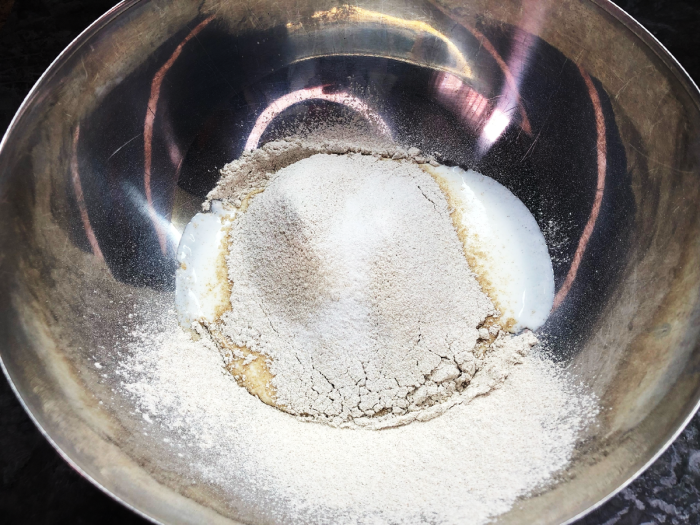 Вливаем в просторную емкость полстакана кефира и добавляем ржаную муку, обязательно ее просеивая через мелкое сито. Муки добавляем столько, чтобы тесто приобрело консистенцию и плотность пластилина, это станет понятно в процессе. Добавляем соль, четверть чайной ложки.