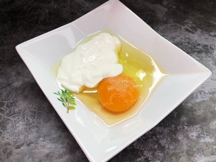 Приготовим т.н. «болтушку» для начинки. Ложку сметаны смешиваем с одним яйцом, тщательно перемешиваем до полной однородности, добавляем маленькую щепотку соли. Этой «болтушкой» мы будем заливать начинку калитки, перед тем, как поставить ее в духовку.