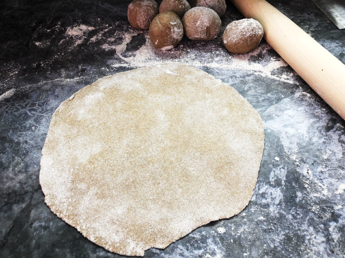 Обильно покрывая ржаной мукой, раскатываем наши колобки в плоскую лепешку, сканец, как говорят в Карелии.