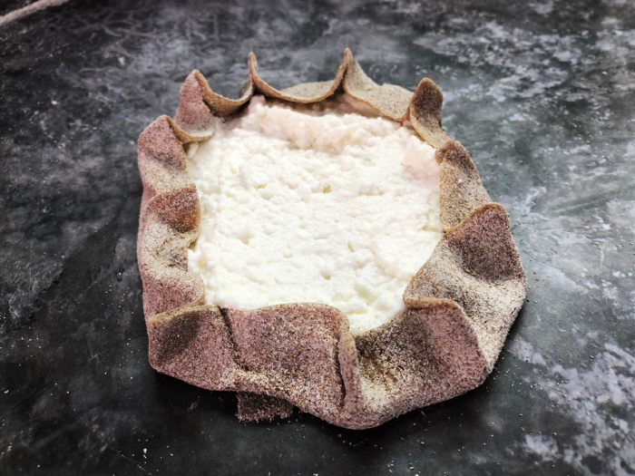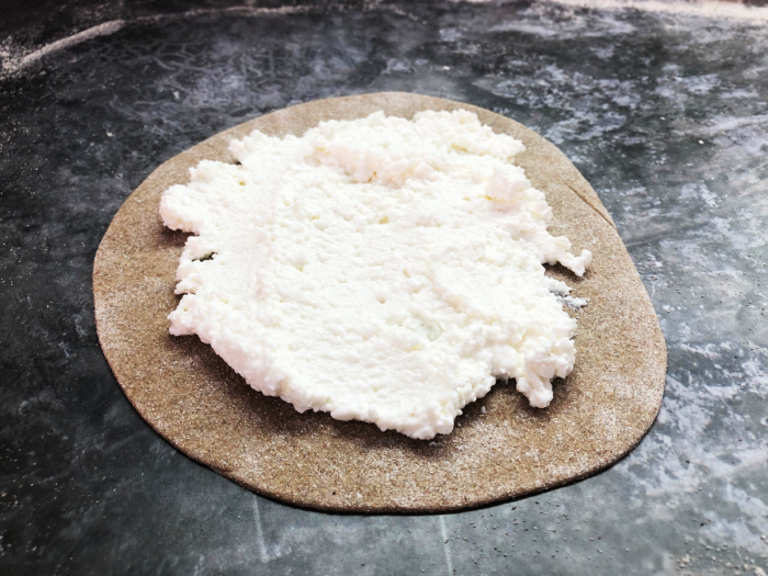 В раскатанное тесто выкладываем начинку. В нашем случае это творог жирностью 9%. Начинку выкладываем таким образом, чтобы она не доходила до края лепешки 15-20 мм. В высоту слой начинки лучше делать не более 10 мм.