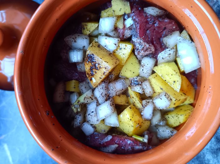 Нарезаем мясо и картошку небольшими кубиками (примерно сантиметр на сантиметр или чуть больше), чтобы заполнить горшочек в равных частях не доходя пары сантиметров до горловины. Добавляем лук, порезанный кубиками примерно по 0,5 см. На один горшочек у меня получилась половина луковицы среднего размера. Добавляем соль и перец по вкусу, хорошо перемешиваем и закладываем в горшочки.