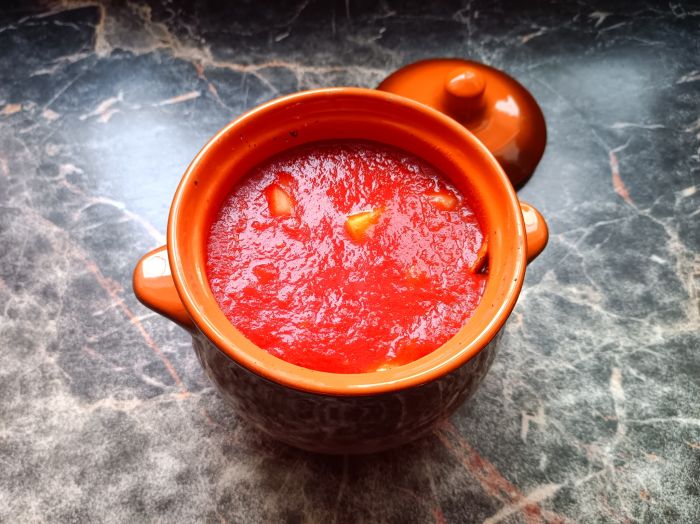 Кстати, если используем сок из томатных консервов, то с соли нужно поменьше - сок уже солёный. Заливаем сок в горшочки так, чтобы до горловины осталось около пары сантиметров.