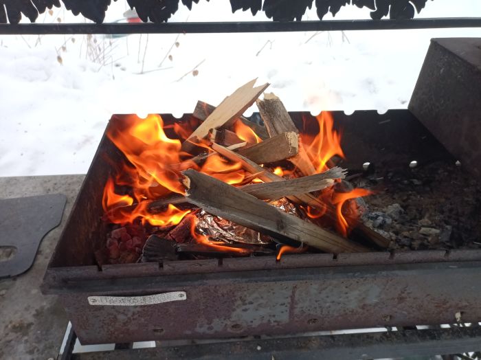 Разжигаем мангал. Углей должно быть столько, чтобы они дошли как минимум до середины горшков. Формируем лунки в углях, как для запекания картошки, устанавливаем в них наши горшки и засыпаем их насколько возможно. Если углей мало, можно докинуть несколько дровишек сверху.