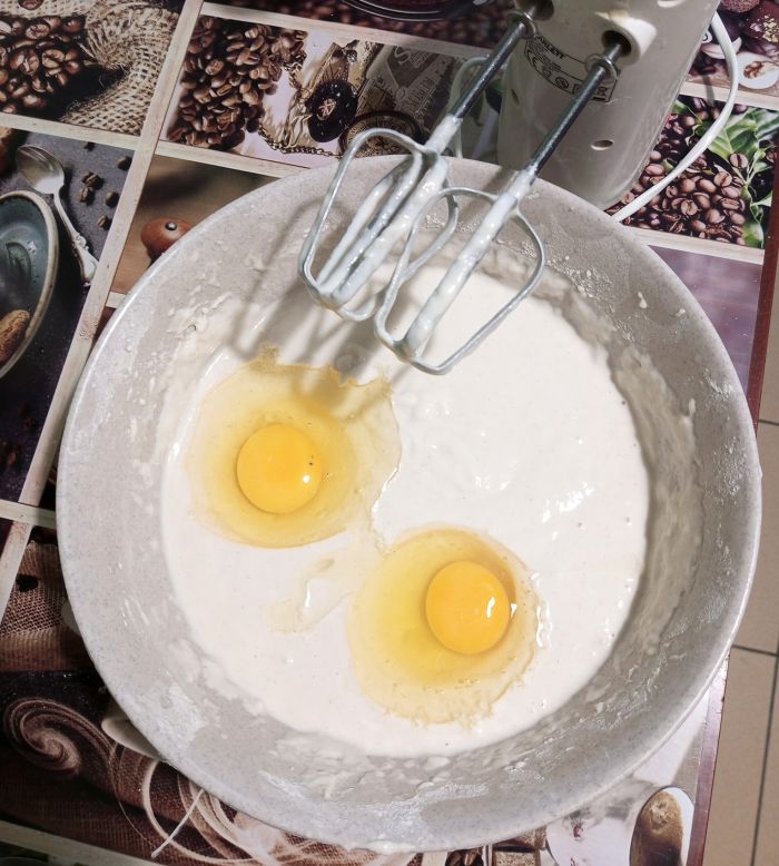 Теперь доводим оставшиеся полстакана сыворотки до начала закипания и вбухиваем туда соду. Она начинает яростно шипеть и пениться, и вот эту пену надо тут же вылить в тесто и вмешать в него. Миксер тут не нужен, достаточно ложки.