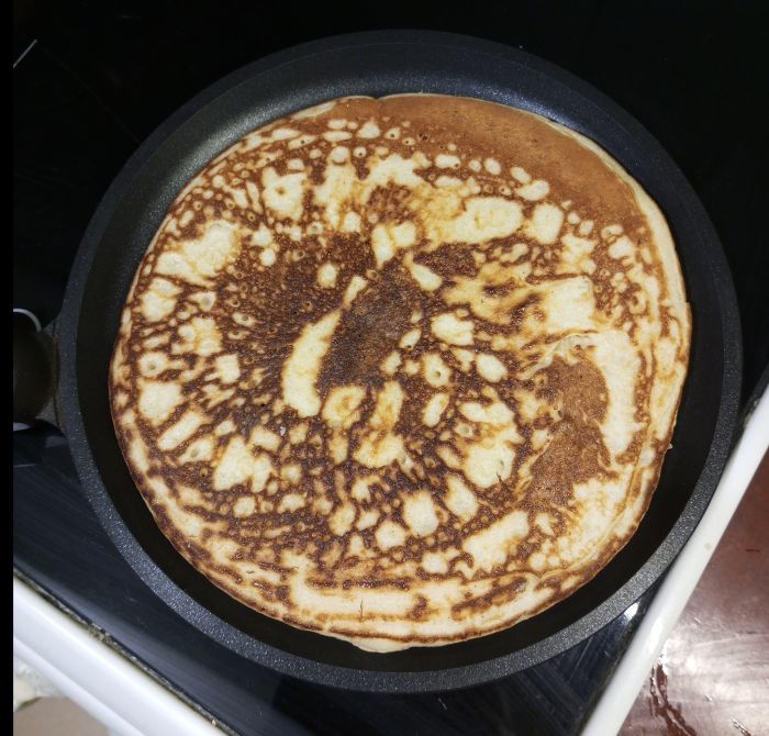 Когда верх блина начнёт схватываться по краям, обычно пора переворачивать. Но никто не мешает приподнять блин лопаткой и посмотреть, хорош ли колер или можно подержать ещё. Затем блин переворачивается и доводится до кондиции. Собственно, это всё — повторяем, пока тесто не закончится.