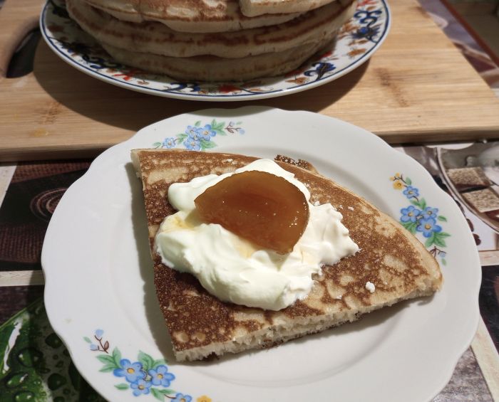 В моём детстве блины были только такие. Блинчики тоже были, но редко, и их никто не ел просто так — в них всегда что-нибудь заворачивали, чаще всего фарш из варёного мяса с луком. Блины же поедались со сметаной или с вареньем, и одного блина на маленького человека, которым я был тогда, хватало за глаза.