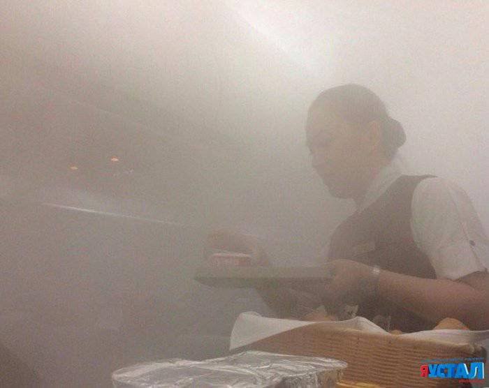 Из-за высокой влажности воздуха снаружи самолета, кондиционер стал циркулировать пар внутри салона.