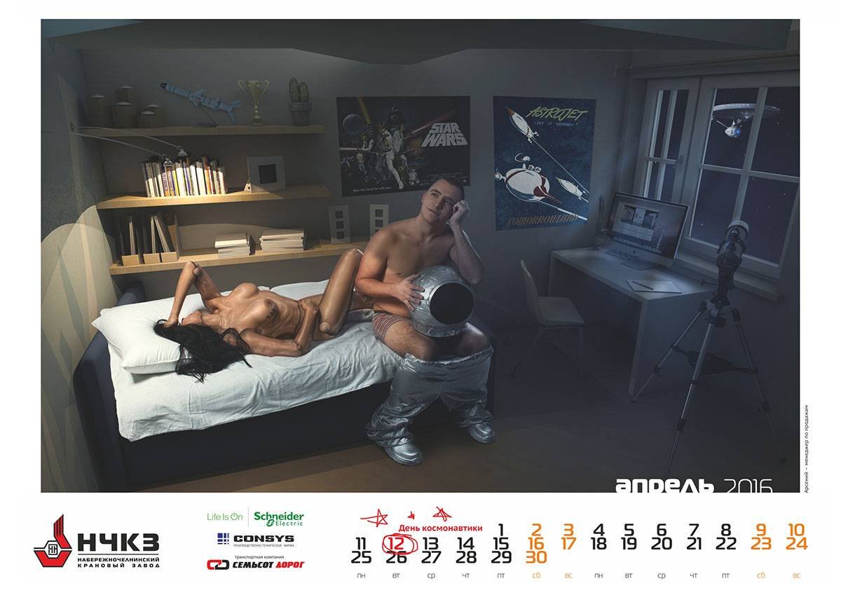 В этот раз темой календаря стали российские праздники, такие как день рождения водки (31 января), день компьютерщика (14 февраля), день клиента (19 марта) и день космонавтики (12 апреля). Получилось очень даже огненно!
