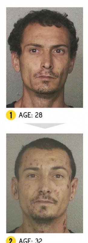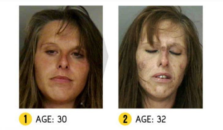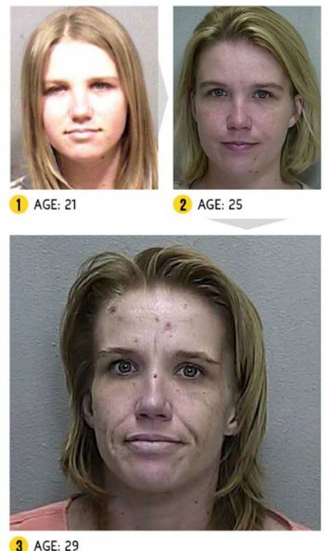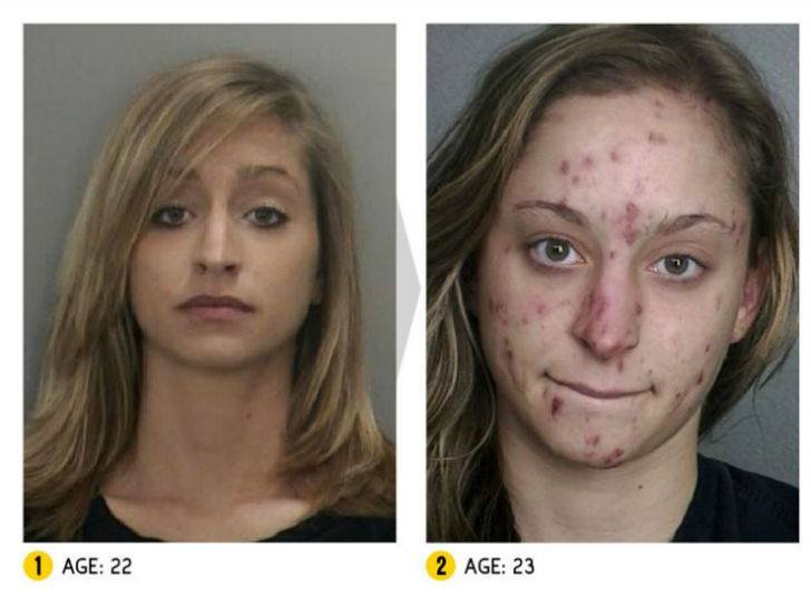 Наркотики по-разному влияют на внешность и здоровье. Из-за метамфетамина человек быстро теряет вес, зубы у него разрушаются, появляются язвы на лице, процесс старения ускоряется. Кокаин также является причиной потери веса и воспаления слизистой носа. От героина у человека появляются абсцессы, он быстро теряет вес и кожа превращается в сплошную зудящую рану.