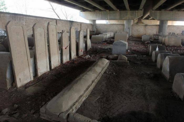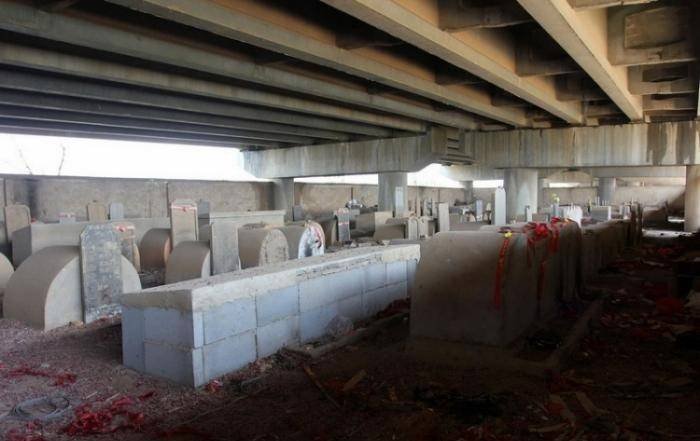 В зоне экономического развития города Ухань, в Китае, обнаружили необычное кладбище. Местные сельские жители хоронят своих родных под мостом, так как в результате массового строительства их деревню в 2008 году лишили места под захоронения. Теперь сельчане уже на протяжении 4 лет вынуждены провожать своих родных под грохот грузовиков, которые проезжают над ними. Кладбище разрастается, теперь здесь насчитывается около ста могил.