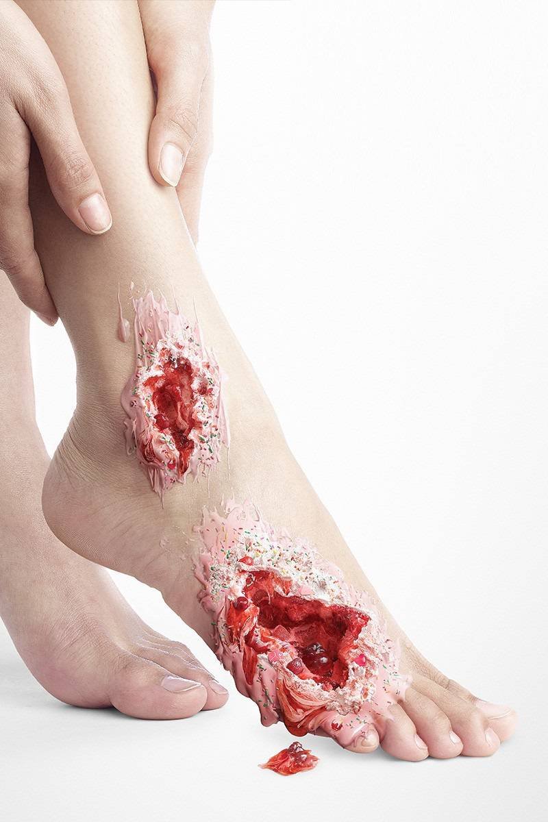 Чтобы помочь распространить информацию о реальной опасности неконтролируемого диабета, тайский дизайнер Nattakong Jaengsem создал серию шокирующих изображений. Серия изображений "Сладости убивают" финансировалась диабетической Ассоциации Таиланда и предназначена, что бы заставить людей уменьшить количество потребляемого сахара. Неконтролируемый диабет может существенно усугубить процесс заживления порезов, язв и ран, так же может привести к серьезным инфекциям.