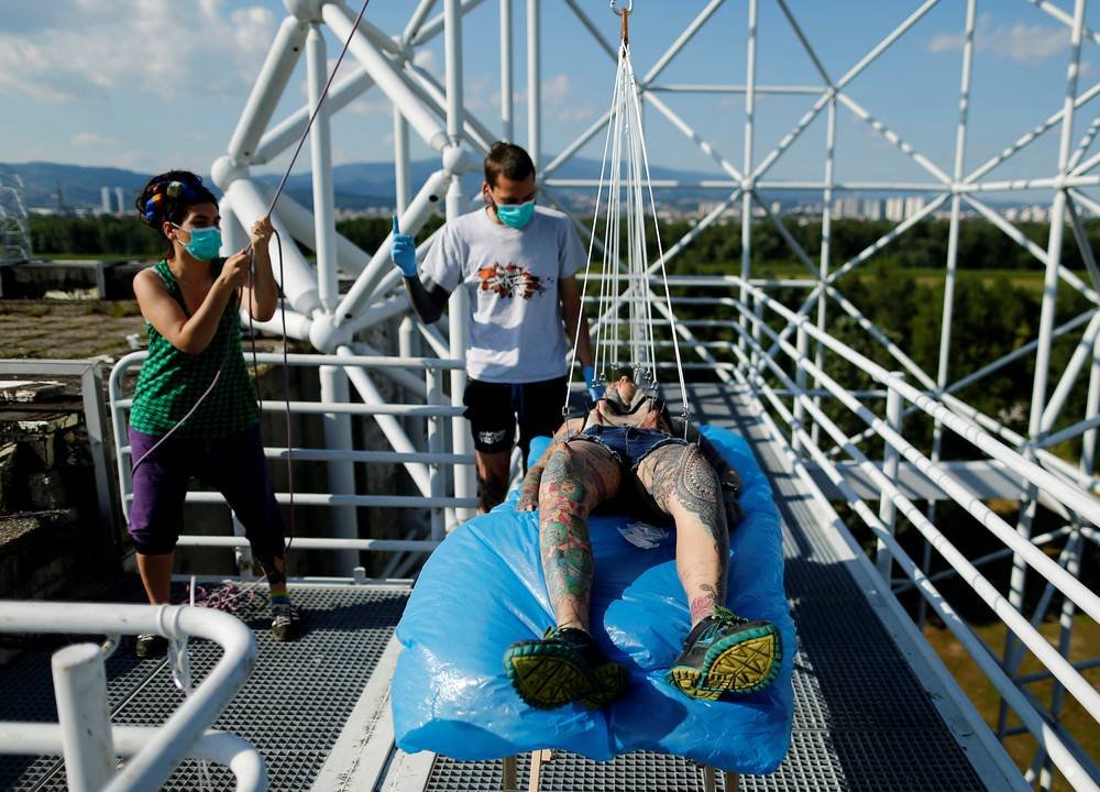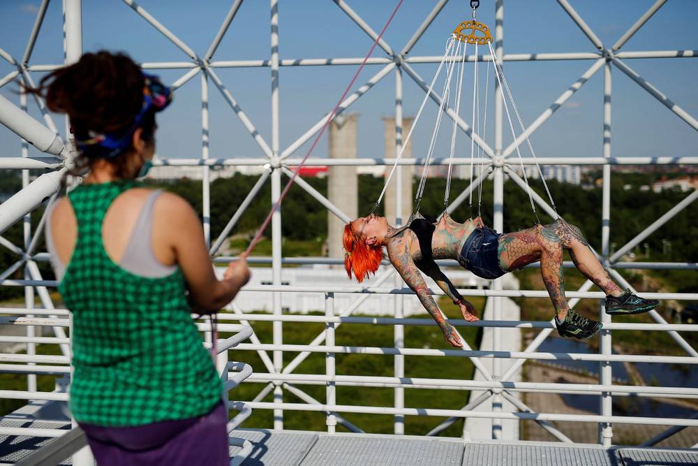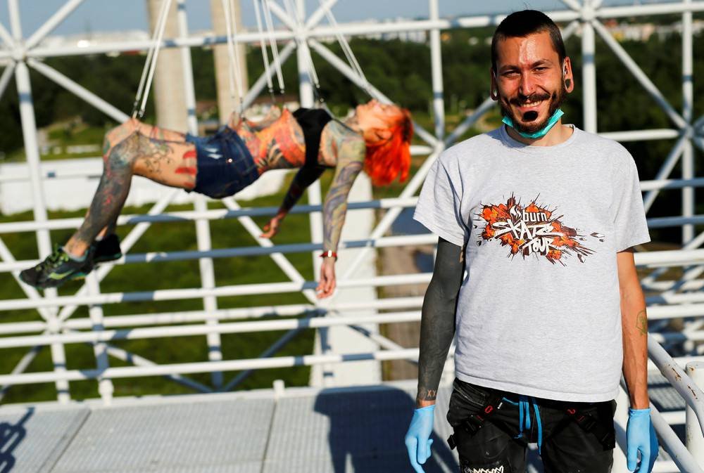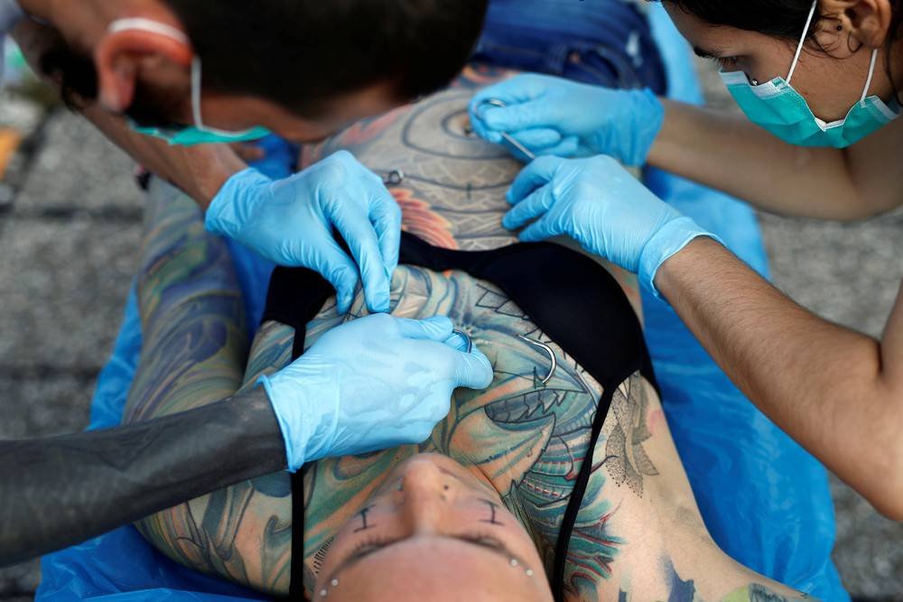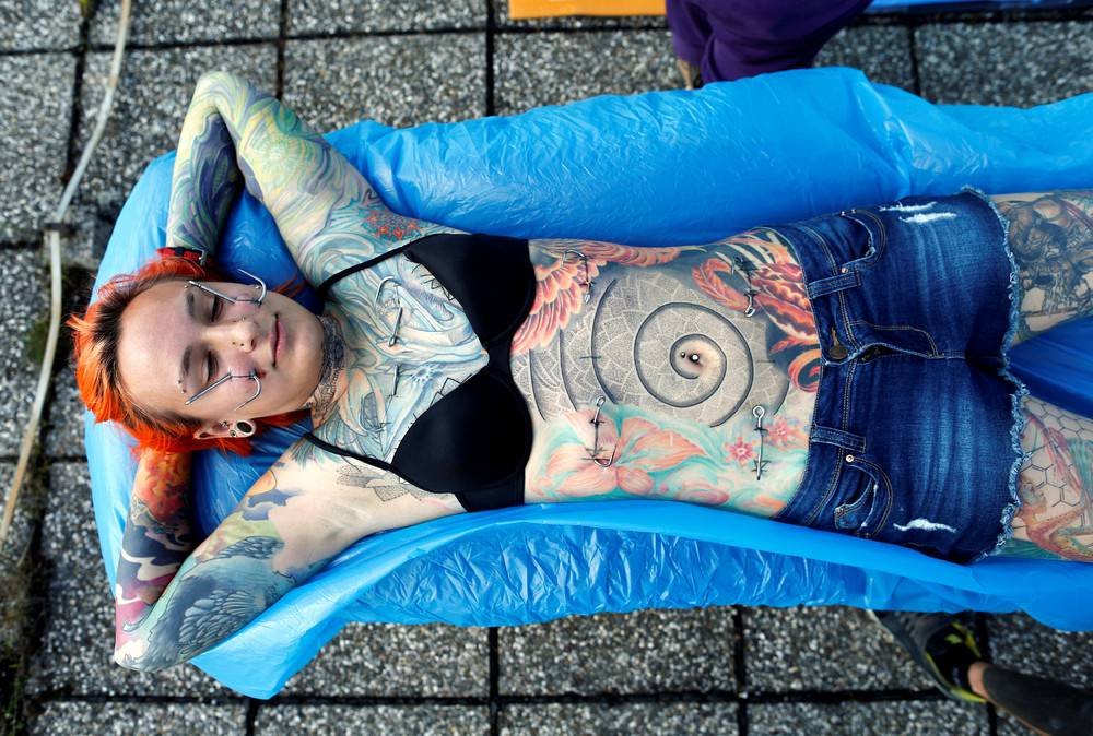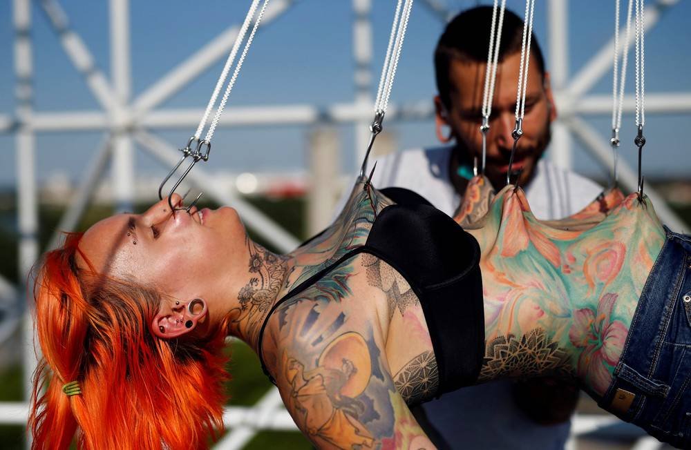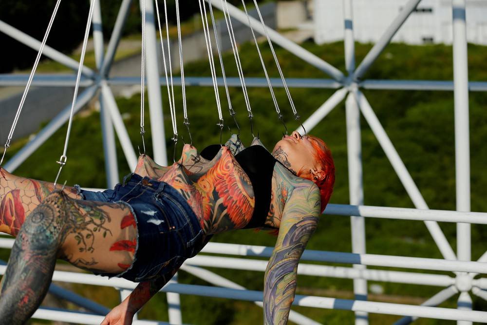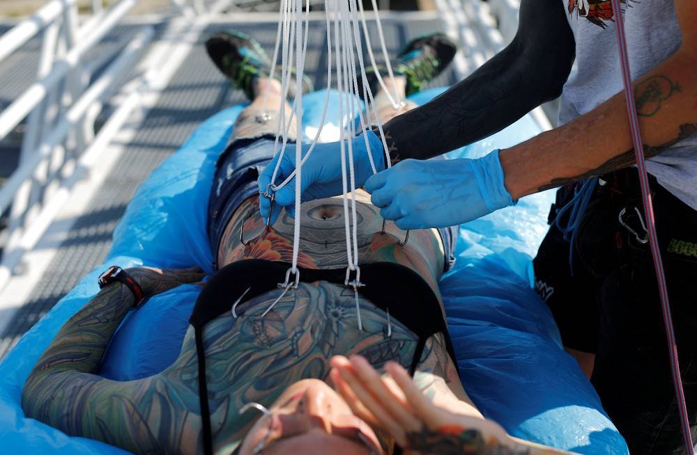 28-летняя американка Кейтлин поразила своей экстремальной способностью: девушка позволила подвесить себя на крюках, задетых за кожу. Пронизывал ее профессиональный художник по телу Дино Хельвида в Загребе в Хорватии, а агентство Reuters опубликовало эти поистине захватывающие и жуткие фотографии одновременно.