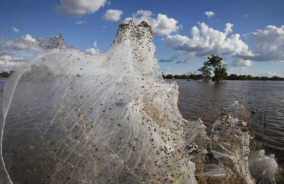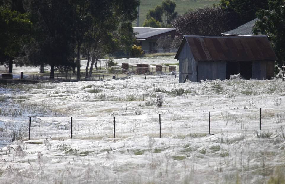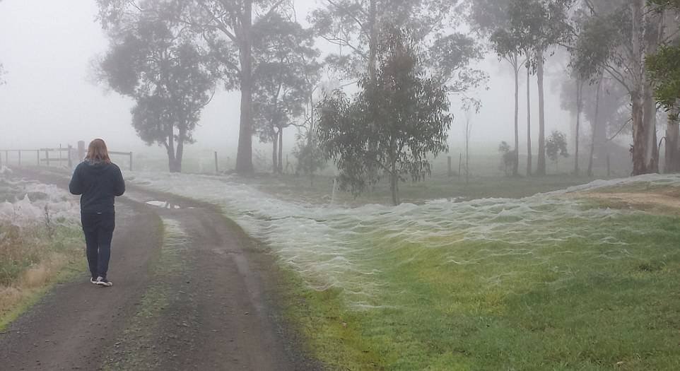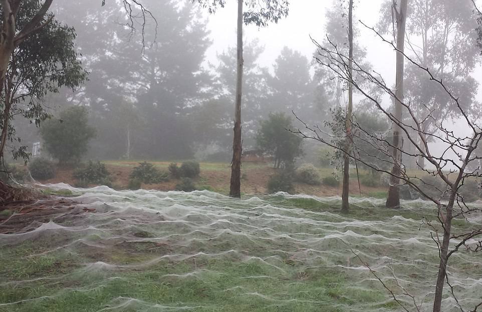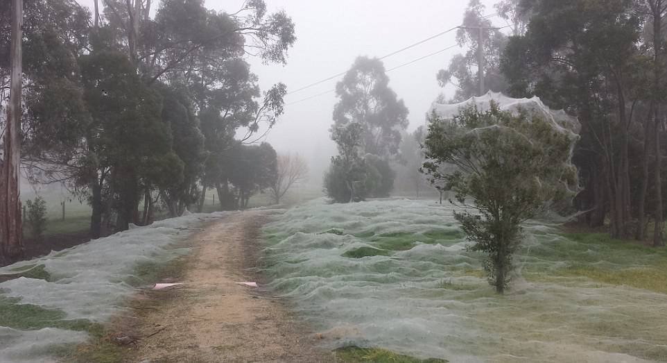 Эти жуткие кадры сделала Лесли Шмидт в парке Yinna, в регионе Джипсленд центральной Виктории, где она с партнером играла в "Pokemon Go". Трава, деревья и сооружения парка полностью покрыты паутиной. Это явление вызвано миграцией пауков в более безопасное место от наводнения. Они выпускают паутинки и при помощи ветра таким образом перемещаются. Выглядит это очень жутко, особенно для тех, кто боится пауков.