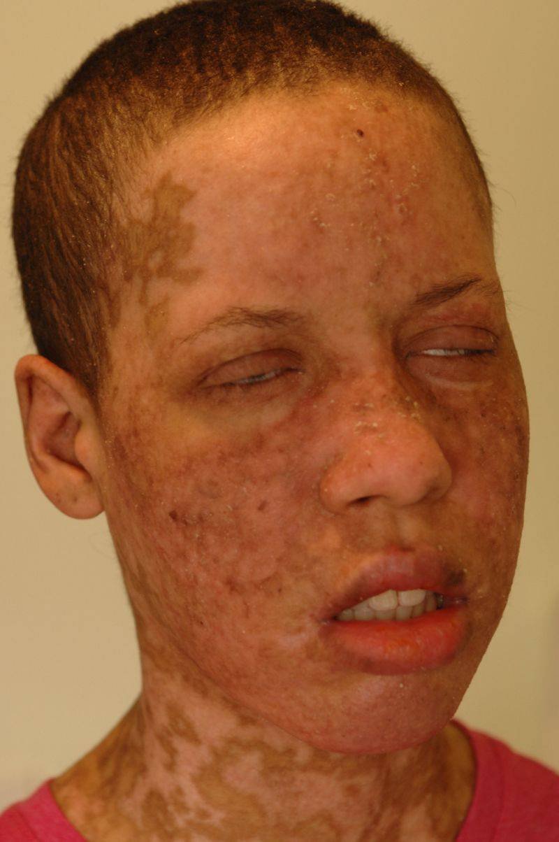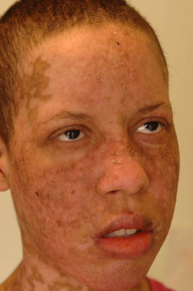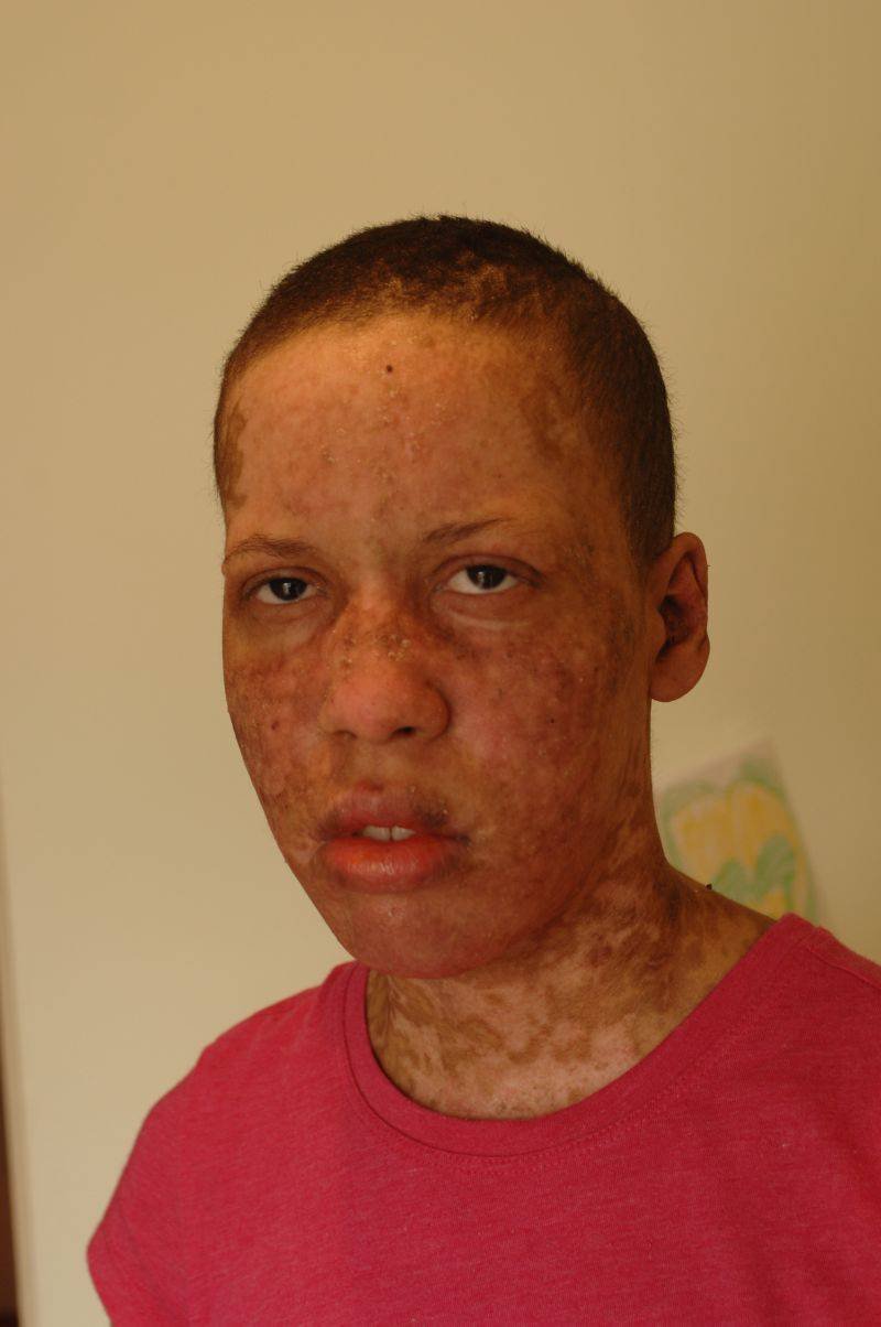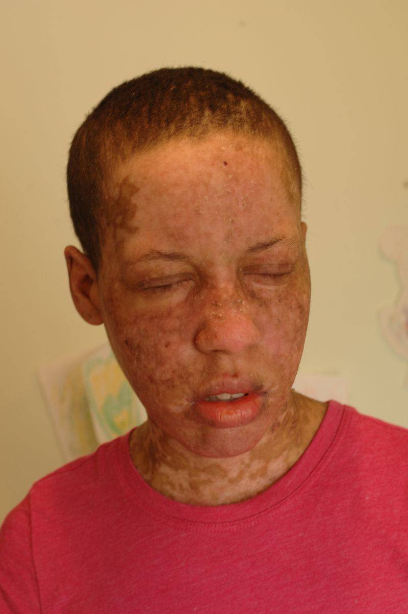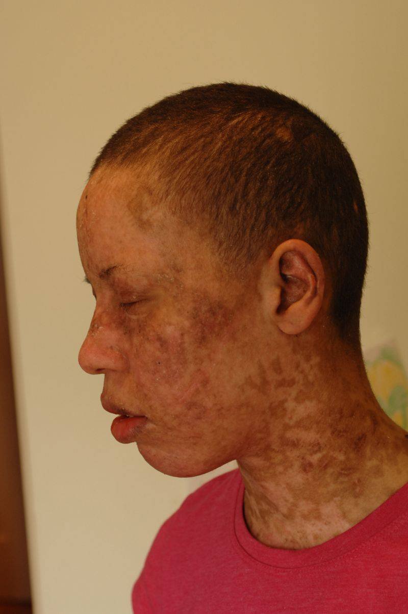 Между первой фотографией в больнице и последней - пять лет. Несмотря на три процедуры химического пилинга и лазерной обработки кожи, она по-прежнему выглядит незавидно.