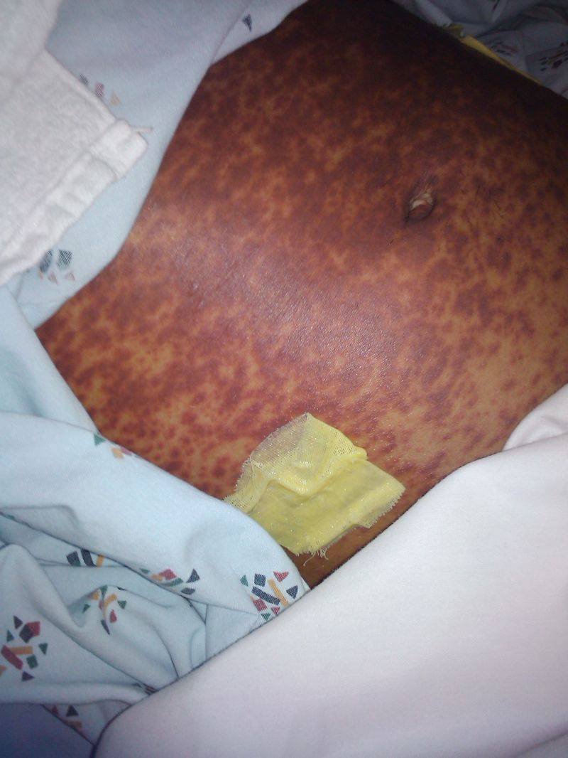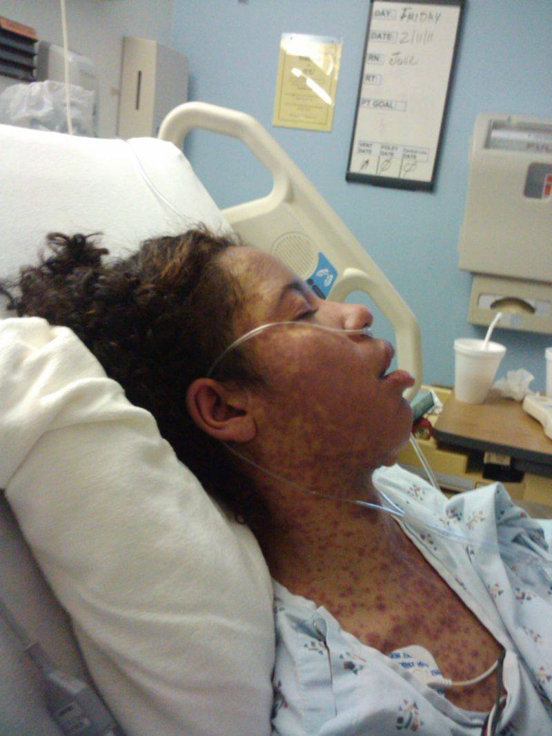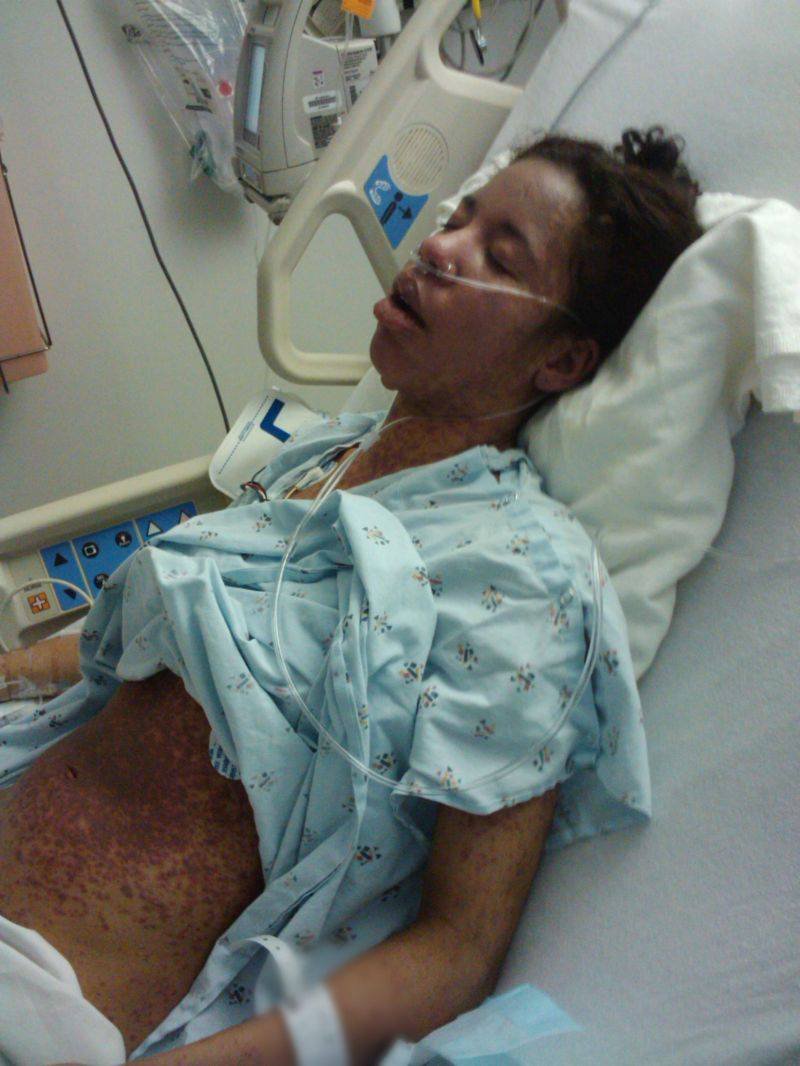 Синдром Лайелла, также известный как токсический эпидермальный некролиз — тяжелейшая форма аллергического дерматита. Возникает как реакция на лекарственные препараты. Эта девушка принимала антидепрессанты и противоэпилептические препараты, но это не имеет значения — подобная реакция может возникнуть на любые фармакологические средства, хотя и вероятность крайне мала.