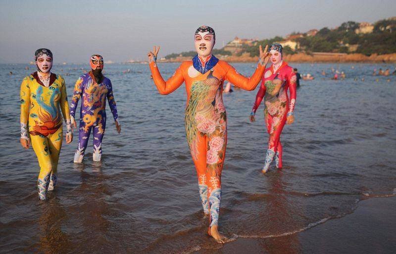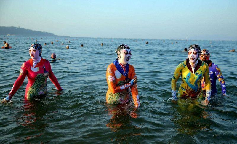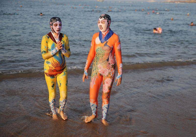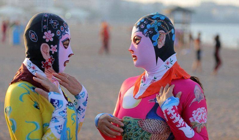 В то время как Франция ввела запрет на ношение "буркини", в Китае дамочки спокойно расхаживают по пляжу в полностью закрытых купальниках. Правда делают они это не руководствуясь религиозными или моральными мотивами, а для того, чтобы защитить кожу от вредного влияния солнечных лучей. С каждым сезоном эти купальники становятся все веселее.