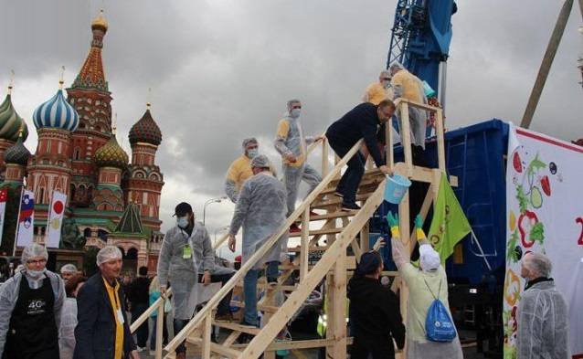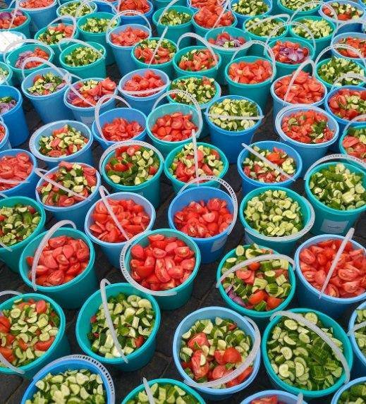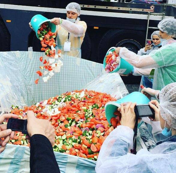 В Москве на Красной площади в рамках закрытия фестиваля «Спасская башня» приготовили самый большой в мире греческий салат. В нарезании овощей приняли участие профессиональные повара, звезды отечественного шоу-бизнеса и волонтеры. В течение двух часов группа примерно из 1000 человек нарезала 20 тонн салата. После того, как рекорд подтвердили представители «Книги рекордов Гиннесса», салат выложили в 100 000 тарелок и раздали всем желающим.