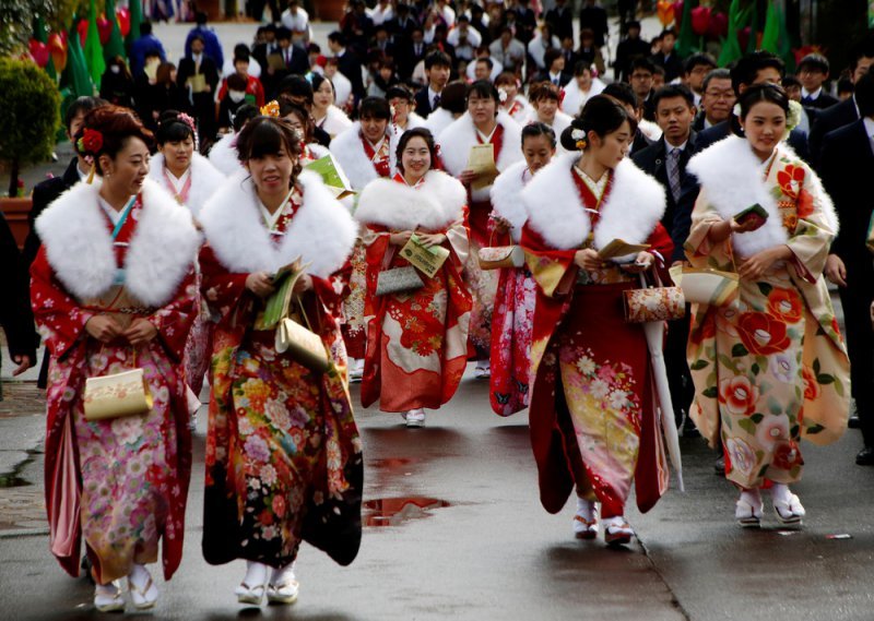 Каждый год во второй понедельник января в Японии отмечается День совершеннолетия, этот день является национальным праздником. День совершеннолетия отмечают те, кому исполнилось 20 лет в прошлом году после 1 апреля, или будет 20 в этом году до 31 марта. С 20 лет все девушки и юноши в Японии считаются взрослыми, они несут полную ответственность за свои поступки перед законом, могут употреблять алкоголь и курить сигареты. В этот день девушки облачаются в яркие кимоно фурисоде, парни в черные костюмы или мужские кимоно.