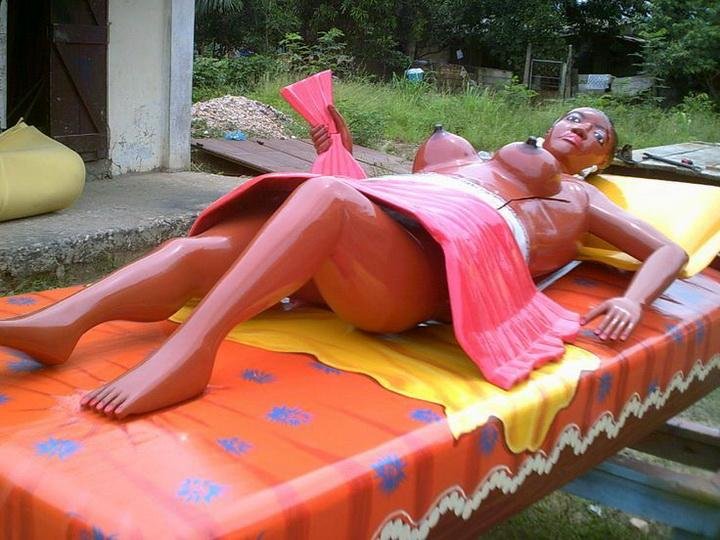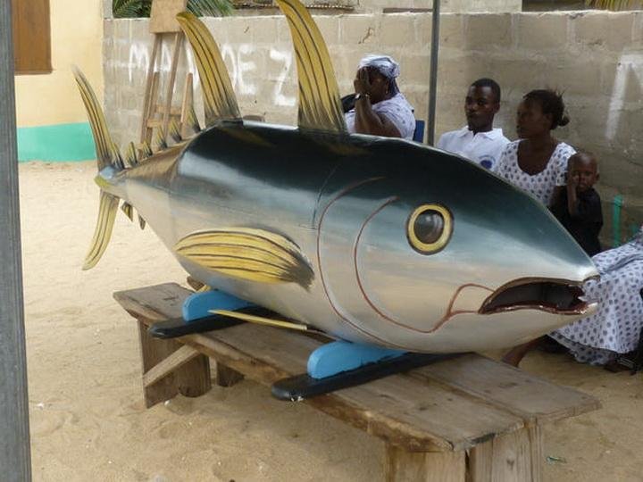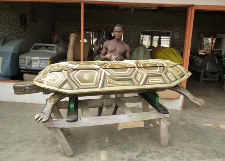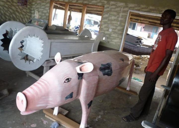 Да-да, именно так, с шуточками и прибауточками хоронят в Гане покойников. Считается, что смерть - это путь к новой жизни, так что и идти туда надо всему такому красивому. Подобные гробы стоят недешево - но это дополнительный повод показать соседям, что не совсем нищеброды. Кстати, совершенно необязательно, чтобы покойник лежал в таком гробу чинно-благородно - как впихнется, так и впихнется, главное, что крышечка какая красивая!
