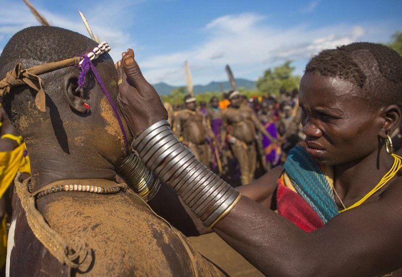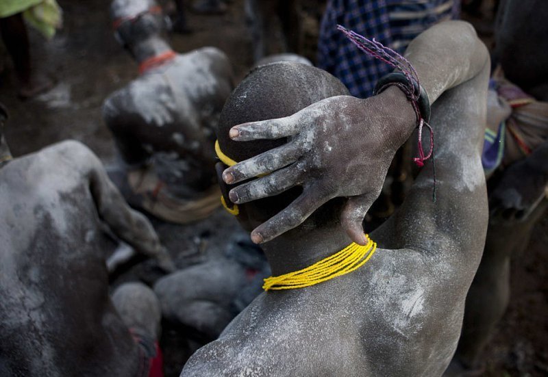 В день церемонии, прежде чем выходить из своих хижин, мужчины покрывают тела глиной и пеплом. Победивший в конкурсе толстяк не получить приз, но он считается героем в племени.