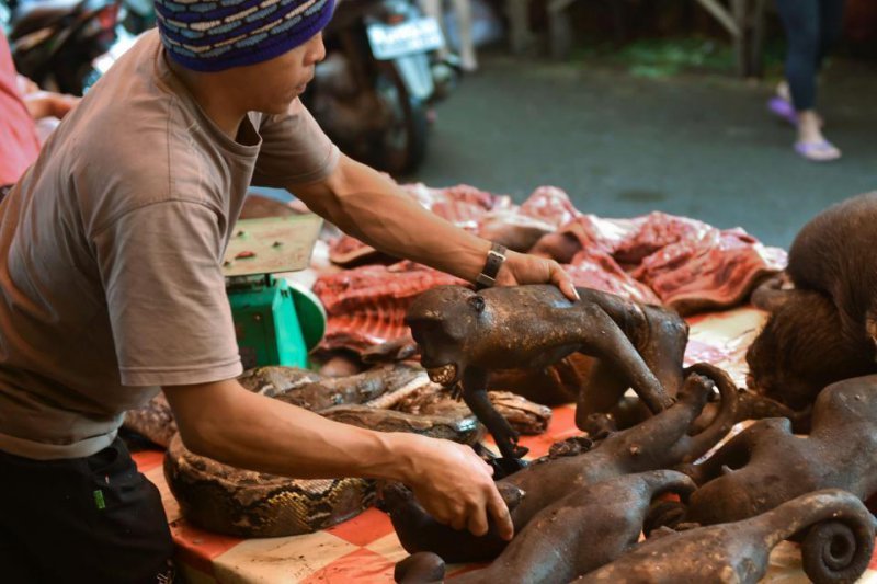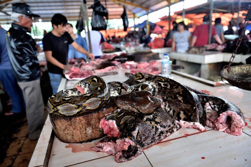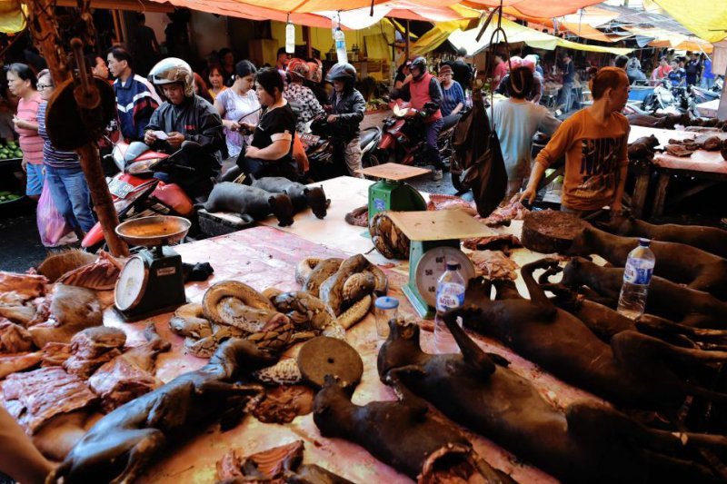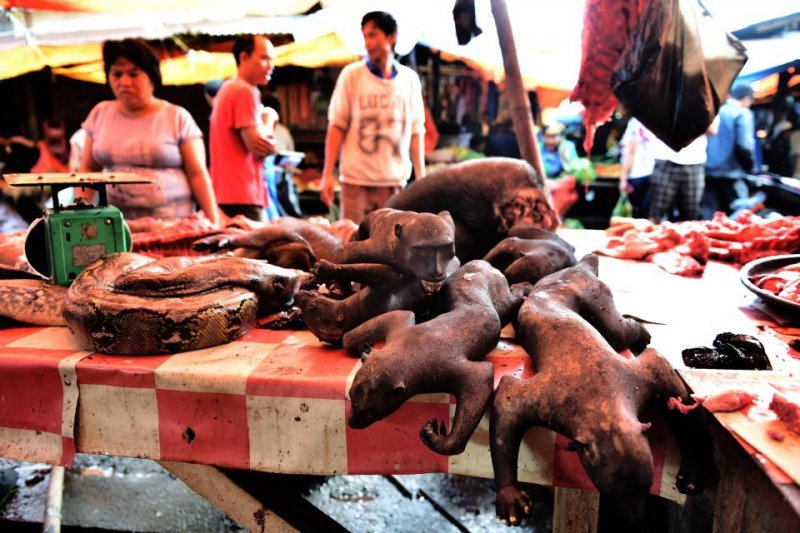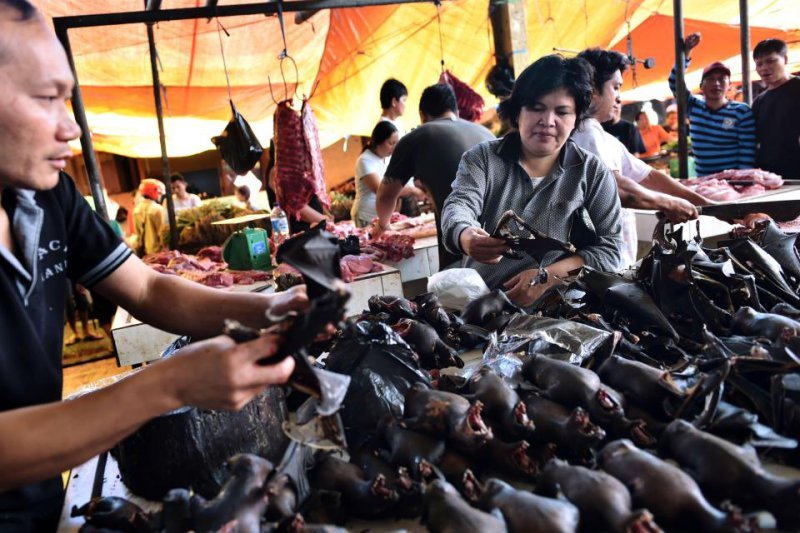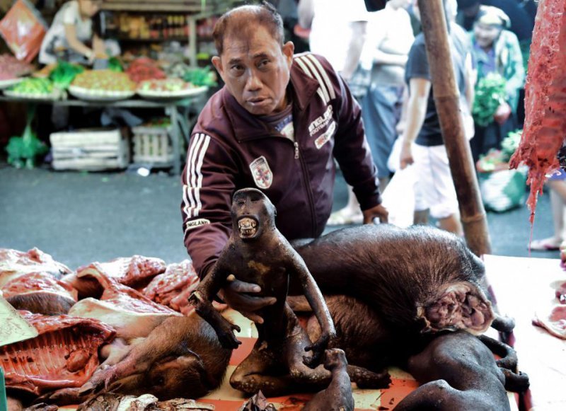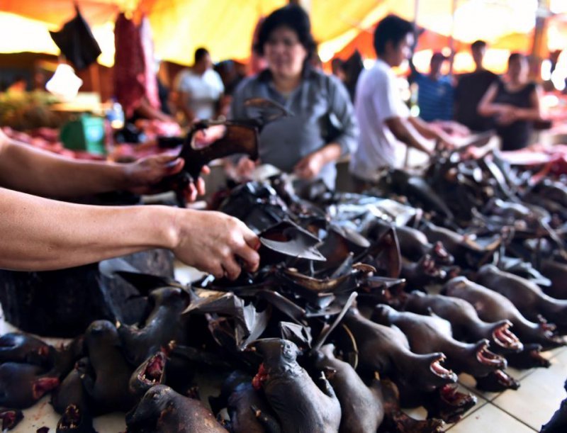 На продуктовом рынке в Индонезии на прилавках лежат зажаренные трупы редких черных хохлатых макак, кучи порезанных питонов, обожженных летучих мышей и собак. Власти активизируют усилия, чтобы убедить жителей деревень на острове Сулавеси прекратить употребление этих экзотических существ, которые составляют часть рациона местного населения. Активисты говорят, макаки, которые находятся под защитой индонезийских законов, находятся на грани исчезновения из-за охоты на них и употребления в пищу.