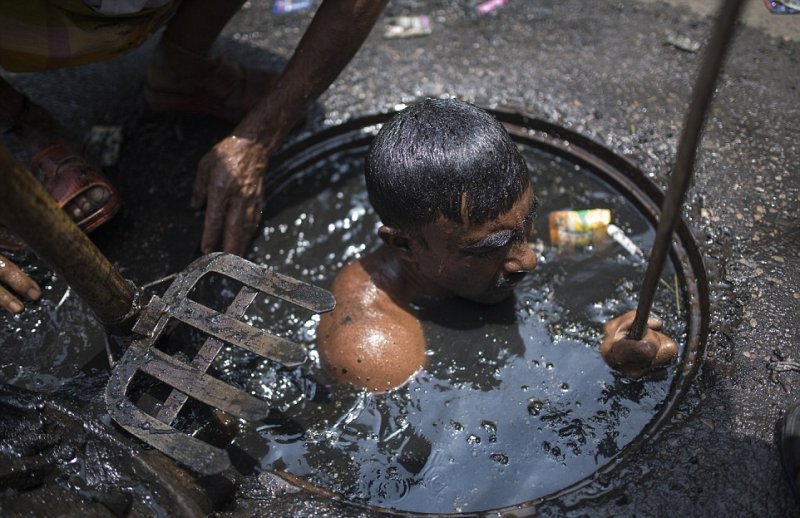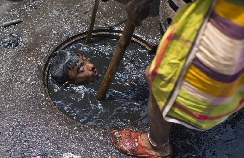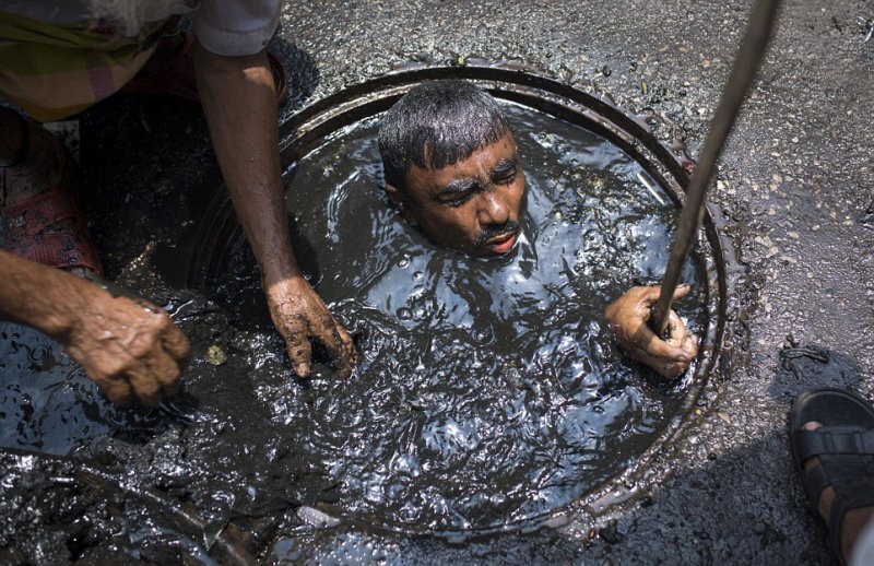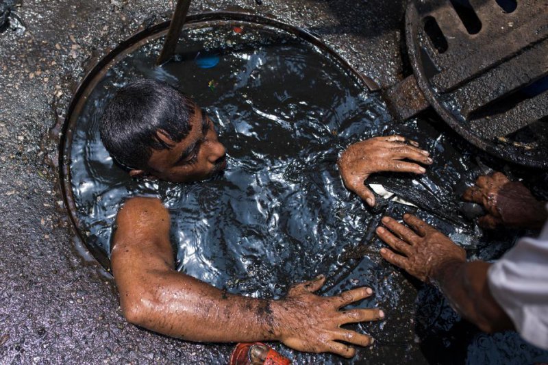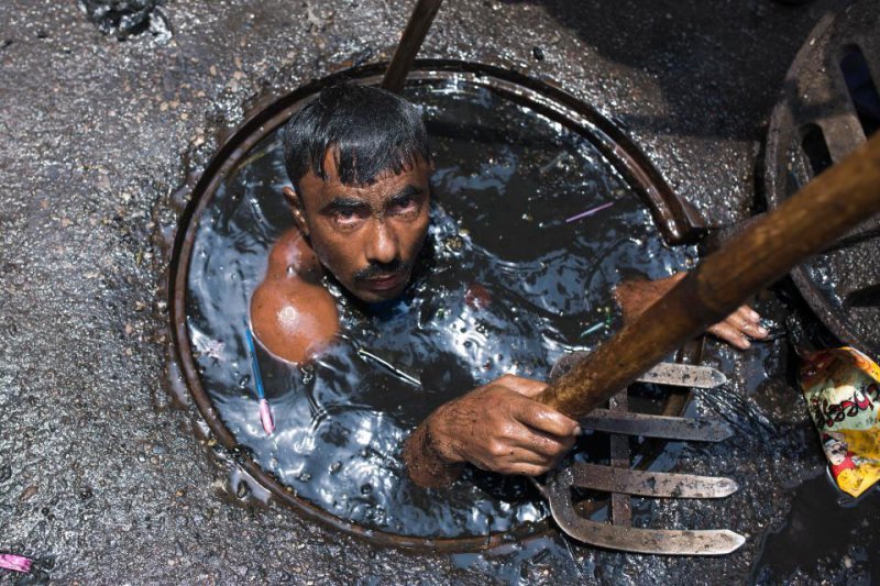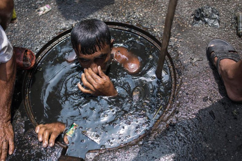 Жалуетесь на свою работу? Тогда посмотрите на условия труда чистильщика канализации в столице Бангладеш Дакке. 14-миллионный город постоянно страдает от сильных наводнений, вызванных проливными дождями. Чистильщику приходиться нырять в мутную зловонную жижу канализации без какой-либо защиты, чтобы практически голыми руками разобрать завалы внутри. Платят за это грязное дело около $380 в месяц.