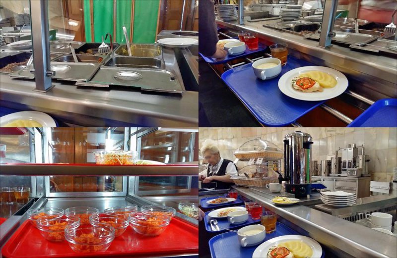 Салаты и компот берешь сам, а далее суп и второе накладывают тётеньки в белых халатах, дальше касса с наличными и касса для оплаты картами.
