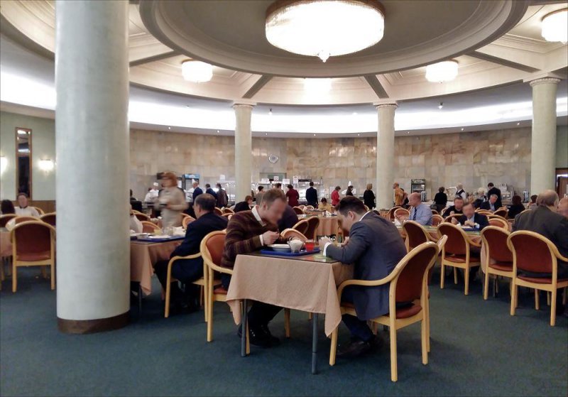 Переходим в "Зеленую" столовую. На дальнем плане стойки с едой и подносами - всё, как в обычной столовой.