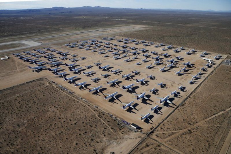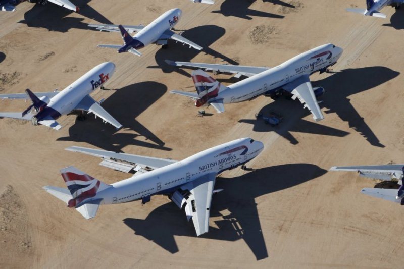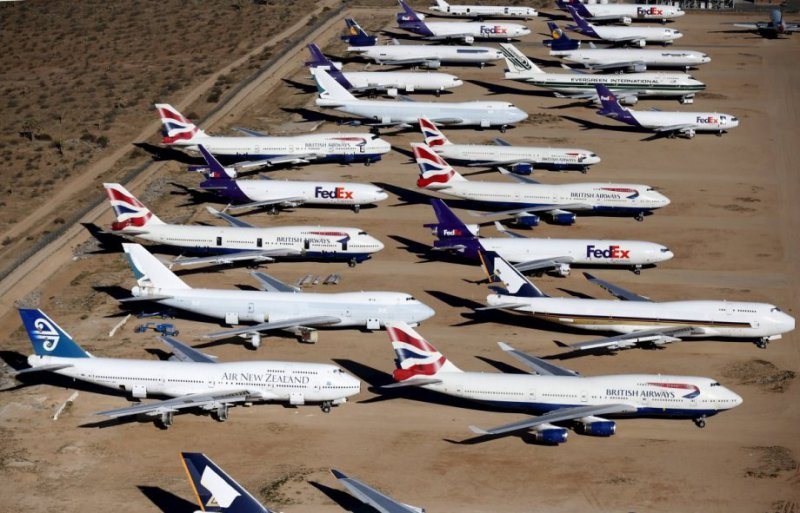 Старые самолеты, в том числе Боинг-747-400, хранятся в пустыне в Викторвилле, Калифорния.