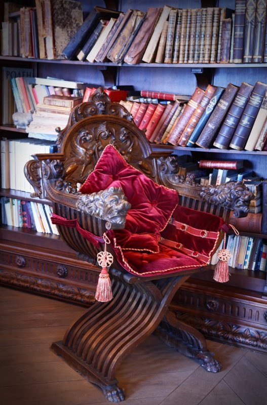 Одну из самых больших комнат занимает библиотека. Здесь собраны сотни книг на старославянском и европейских языках. Каждый экземпляр имеет свою историю, как, впрочем, и сами книжные шкафы, приобретенные на аукционах и привезенные из Англии, Франции, Италии.