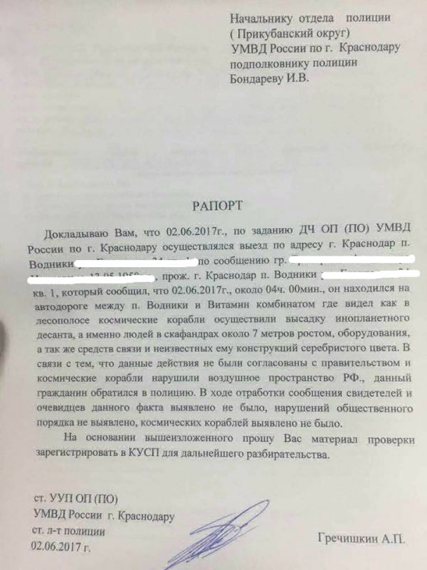 В полиции отмечают, что при подаче заявления 59-летний краснодарец находился в совершенно адекватном состоянии. По словам пожилого мужчины, 2 июня около 4 утра космические корабли инопланетян нарушили воздушное пространство Российской Федерации, после чего из них высадились в лесополосе у краснодарского Витаминкомбината семь семиметровых существ в скафандрах.
