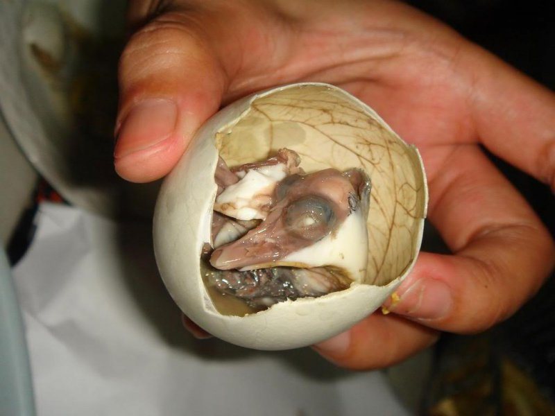 В Эль Нидо каждый день двое детей-продавцов ходят по всему городку и кричат «Балууууут, чичарооооон». Здесь в Думагете на набережной есть специально отведенная часть с кучей лоточников и столиками, где едят только балут и еще какие-то местные «деликатесы». Чичарон (чипсы из свиной кожи) нам был не интересен, а вот балут хотелось описать. Тем более, что это не такое уж испытание, как неприятные на ощупь языка жареные насекомые, продающиеся в Таиланде, или того страшнее — живые личинки. Но почему-то некоторые относят балут к одним из самых омерзительных деликатесов. За что?