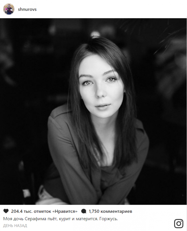 "Моя дочь Серафима пьет, курит и матерится. Горжусь" - именно такими словами Шнуров подписал черно-белое фото девушки в своем инстаграме. Большинство комментаторов оценили данный пост как провокационную шутку и поддержали певца, подчеркивая красоту его дочери - несколько мужчин даже начали набиваться Шнуру в зятья.