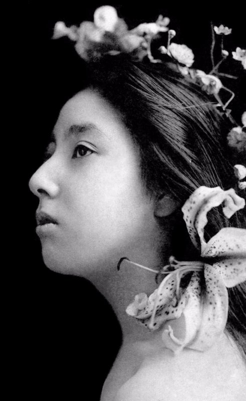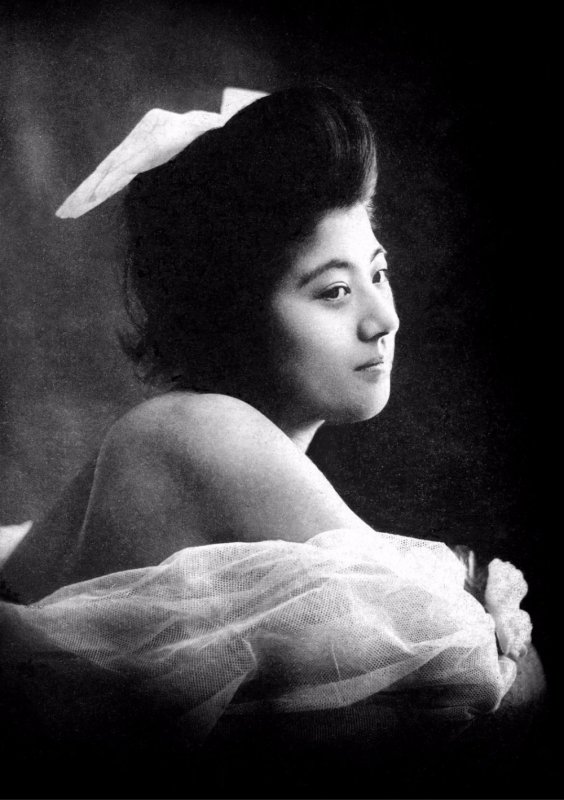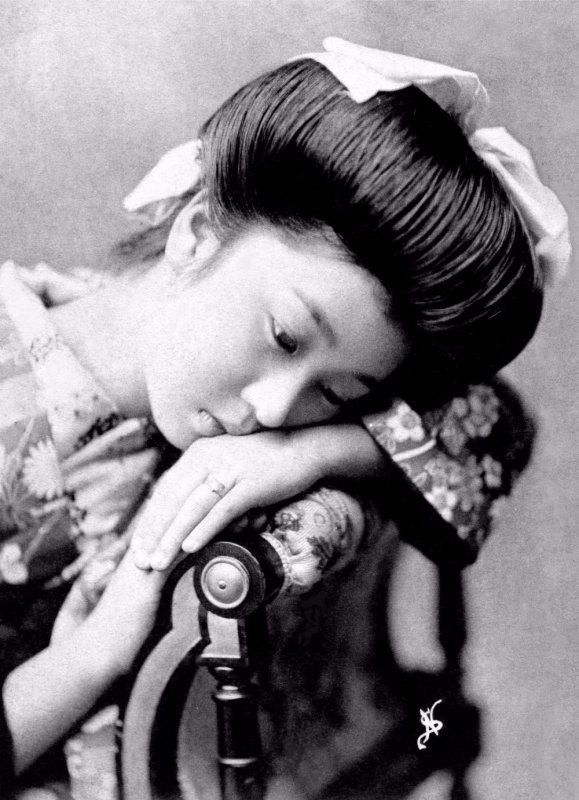 Неизвестный японский фотограф, сделавший эти снимки в 1900-х годах, должно быть, предпочитал любоваться гейшами, свободными от сковывающей одежды и без строгой укладки волос. Он нанимал гейш и их учениц, чтобы они позировали для студийной съёмки именно в таком виде.