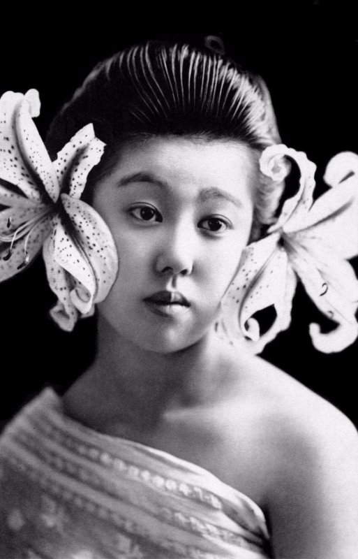 Для этих чёрно-белых фотографий гейши позировали без кимоно и в основном с распущенными волосами вместо традиционных причёсок.