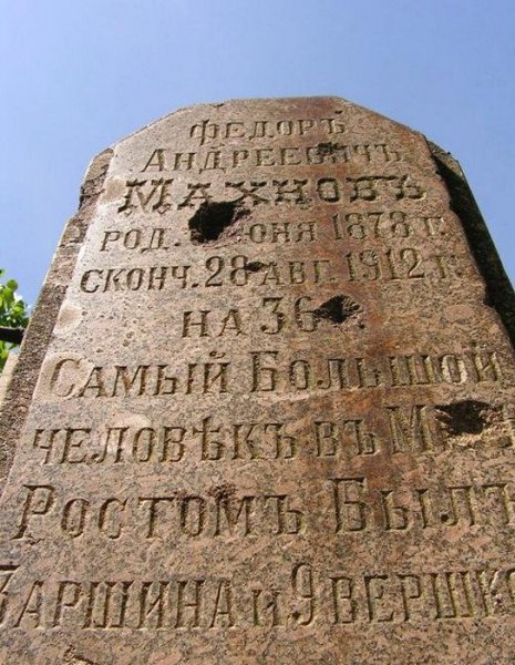 На каменном надгробии написано: «Федор Андреевич Махнов. Родился 6 июня 1878 года. Умер 28 августа 1912 года. Самый высокий человек в мире. Ростом был 3 аршина 9 вершков». На самом деле рост указан неправильно: величина 3 аршина 9 вершков (254 сантиметра), которая на 30 сантиметров меньше фактической, была взята из контракта, который Федор Махнов заключил в 16 лет.
