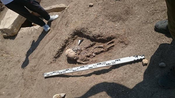 Рядом с головой скелета обнаружили лепной сосуд, мелкие бусины и пастовое стекло, а на его правой руке был найден браслет из медного сплава. В слое, где нашли эту могилу, встречаются захоронения от I века до новой эры по III век новой эры. К этому же периоду относятся каменные усыпальницы, в которых предположительно хоронили военную знать Боспорского царства — античного государства к северу от Черного моря.