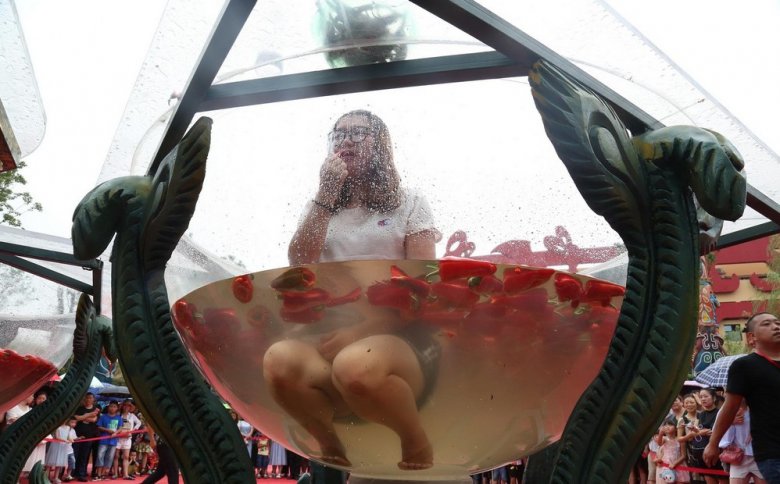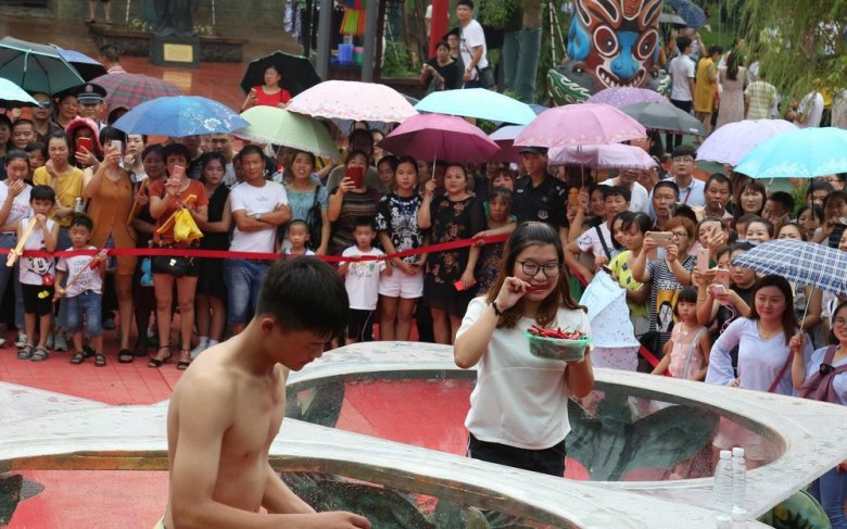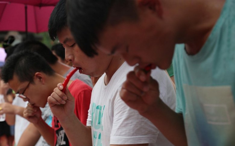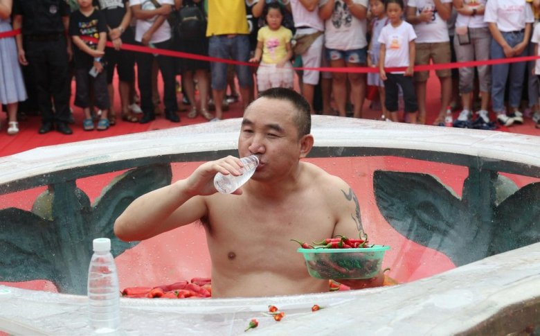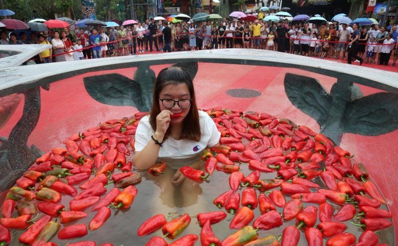 В китайской провинции Хунань прошло необычное соревнование по скоростному поеданию красного острого перца. Мужчины и даже барышня уминали чили, купаясь в огромной миске с красным перцем. Победителем стал участник, проглотивший 15 острых перцев всего за одну минуту.