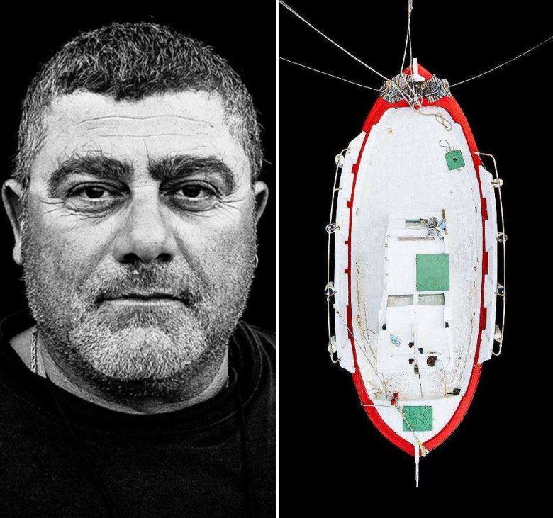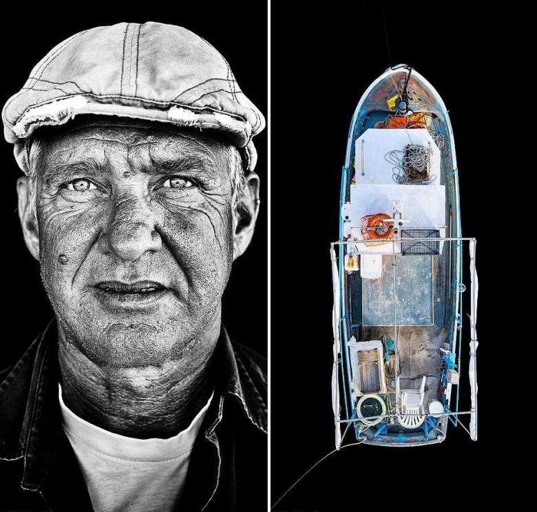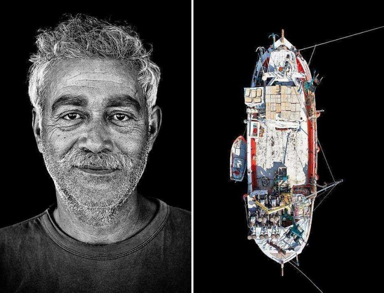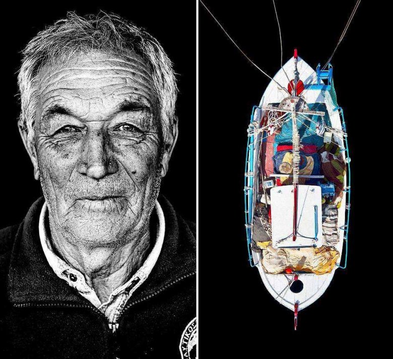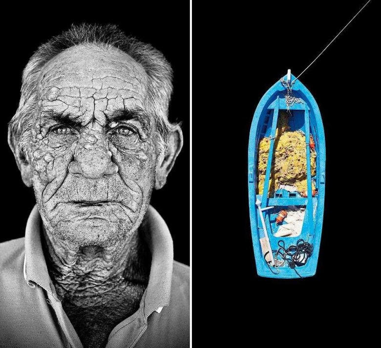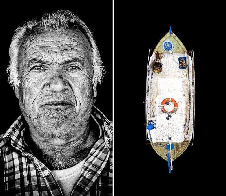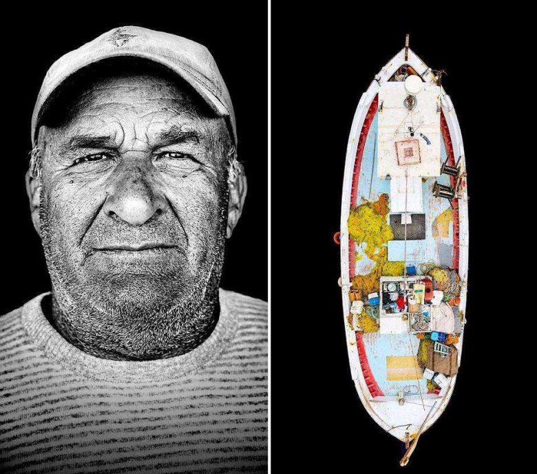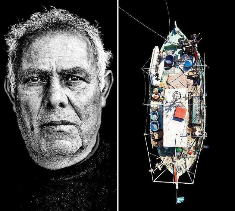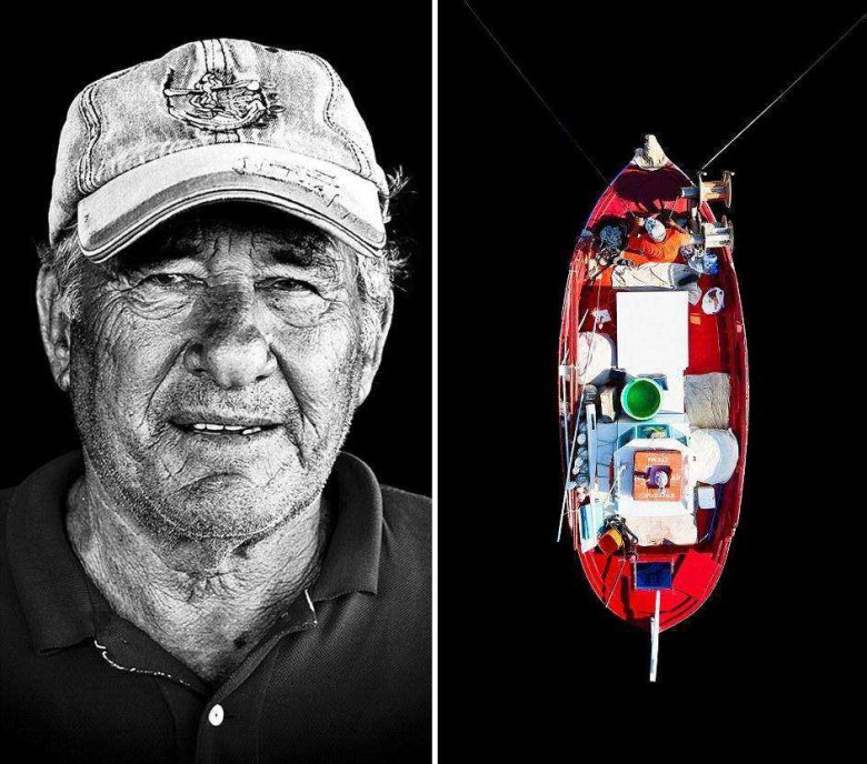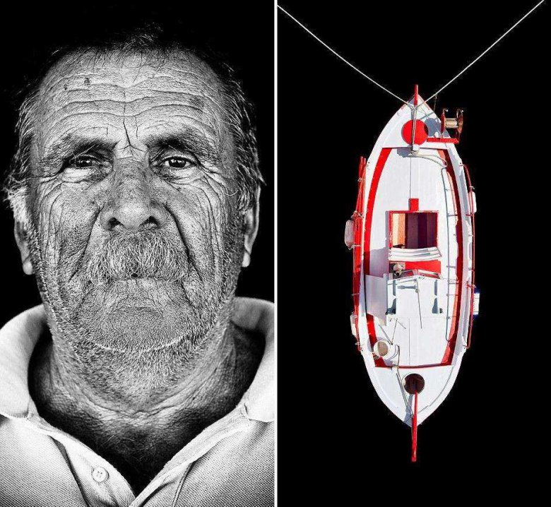 Фотограф соединил монохромные портреты рыбаков — их выразительные грубые лица, контрастирующие с черным фоном, — с цветными изображениями их простых деревянных лодок, которые плавают в чернильных водах Средиземного моря.