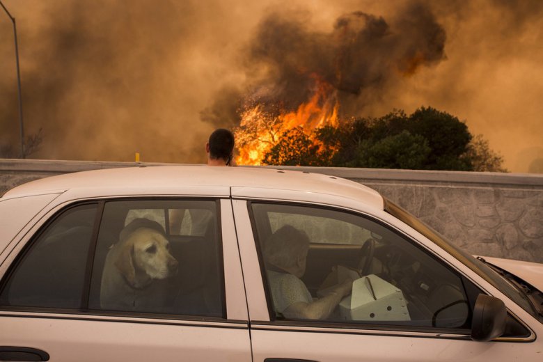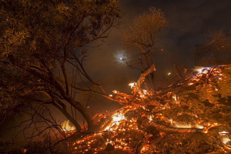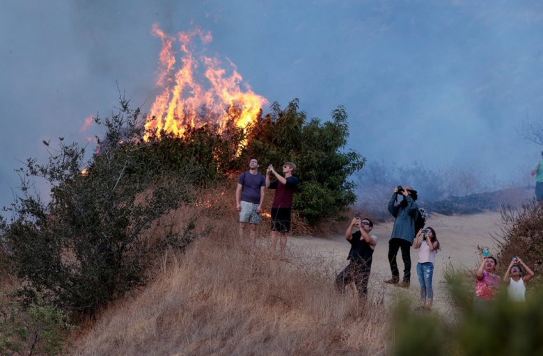 По мере того, как близ Лос-Анджелеса температура продолжает держаться у отметки в 41 градус, фотографы и местные жители снимают и выкладывают фотографии и видео страшного пожара.