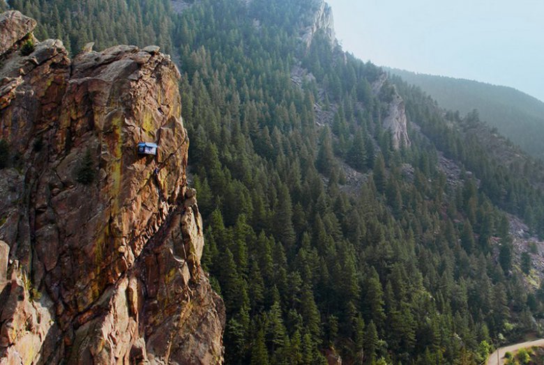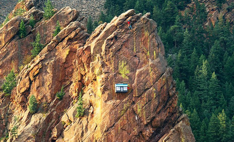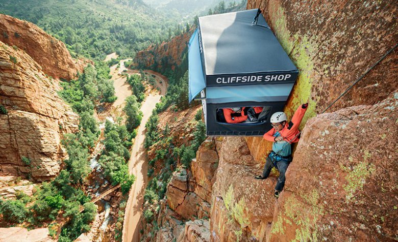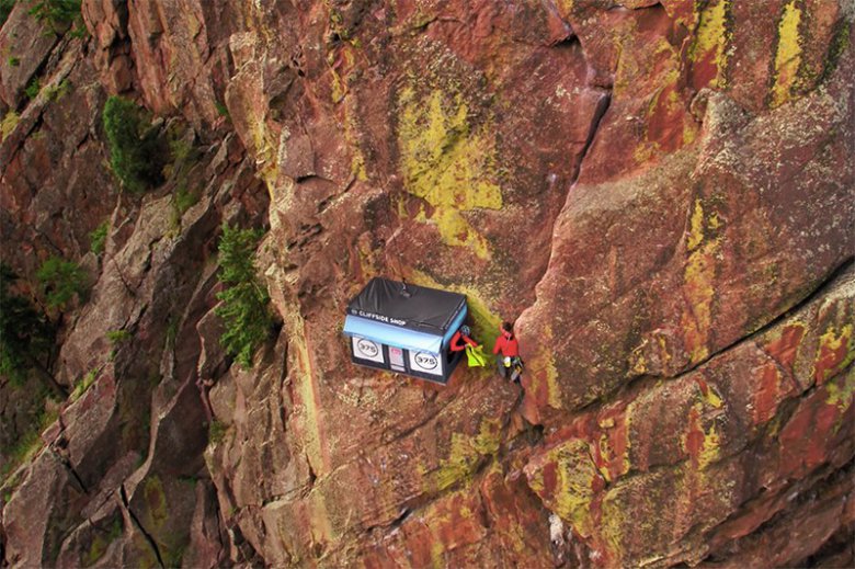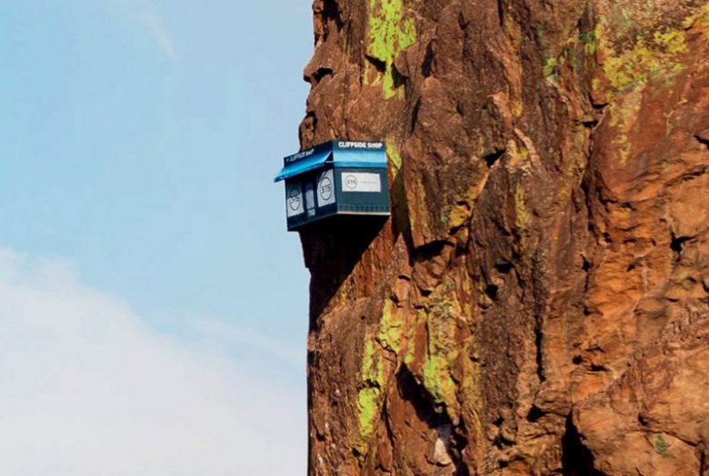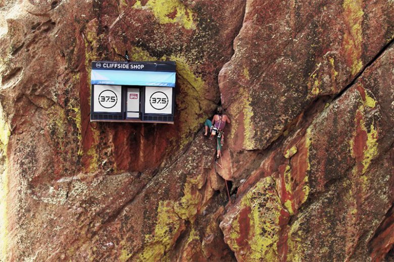 На выступе одной из скал в каньоне Эльдорадо, штат Колорадо, открылся подвесной магазин Cliffside Shop для альпинистов. Получить толстовки, носки и снаряжение можно и бесплатно, но для этого нужно подняться почти на 100-метровую высоту. Теперь альпинисты могут отовариться на пути к вершине живописной горы.