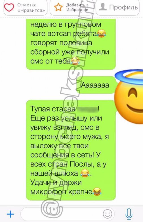 "Мне абсолютно безразлично на твои запугивания с прокураторой и прочей ерундой. Усмири себя и своего менеджера. Возможно, что ты даже не подозреваешь о том, что в общей конфе футболистов тебя все стебут. Я понимаю, что ты готова с любым, лишь бы засветиться, но тебя даже в компаниях называют футбольной и потрепанной шлюхой", - написала женщина.