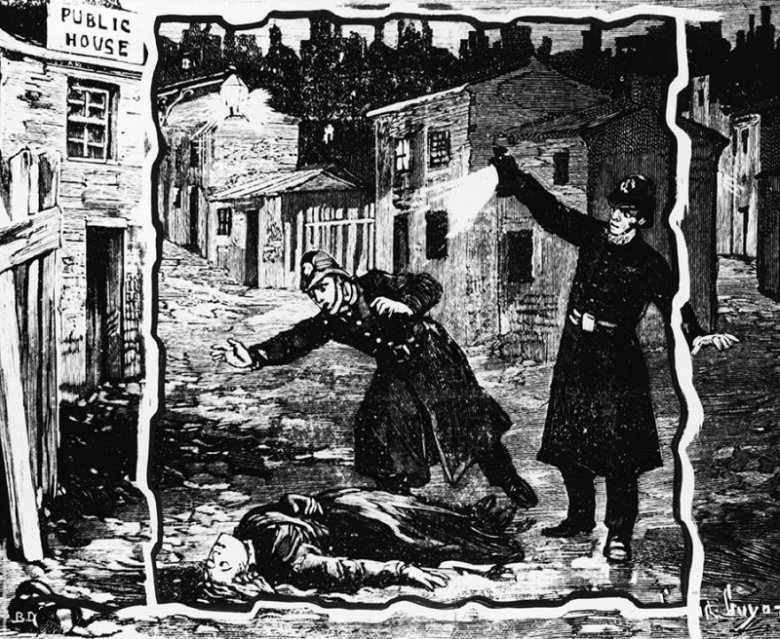 Полиция работает на месте преступления, где была обнаружена одна из жертв Джека Потрошителя.