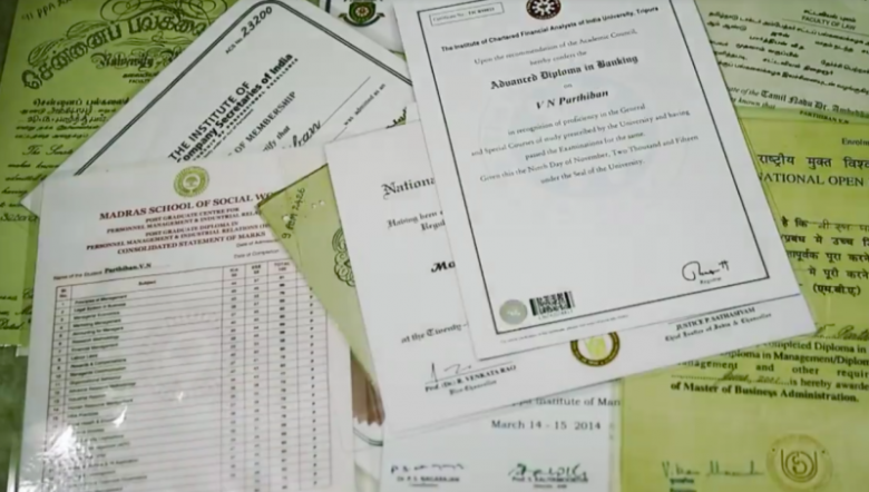 У Партибана степени в различных областях и он преподает более 100 предметов в разных колледжах в Ченнаи. Один взгляд на визитную карточку профессора вызовет неминуемое головокружение: после имени у него стоят более сотни степеней, которые он прибрел в последние несколько десятков лет. Длинный список включает в себя степень магистра в области права, коммерции, искусства, бизнес-администрирования и многие другие.