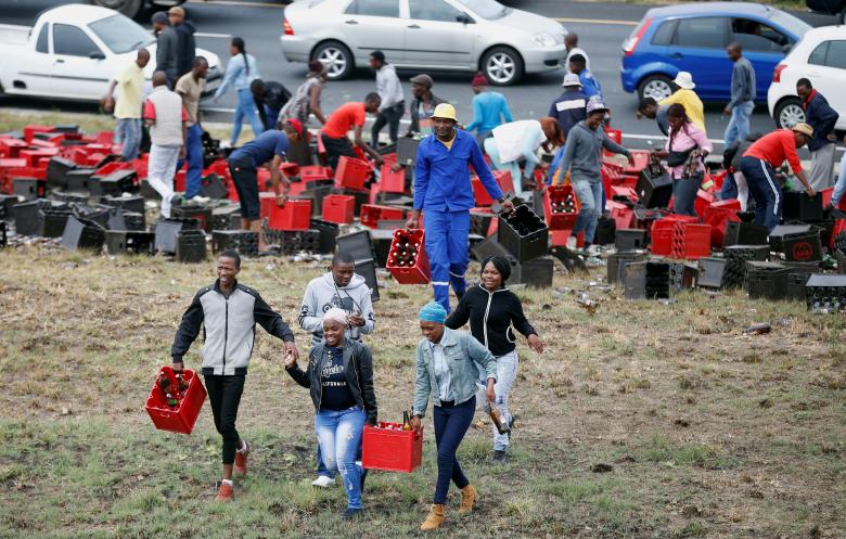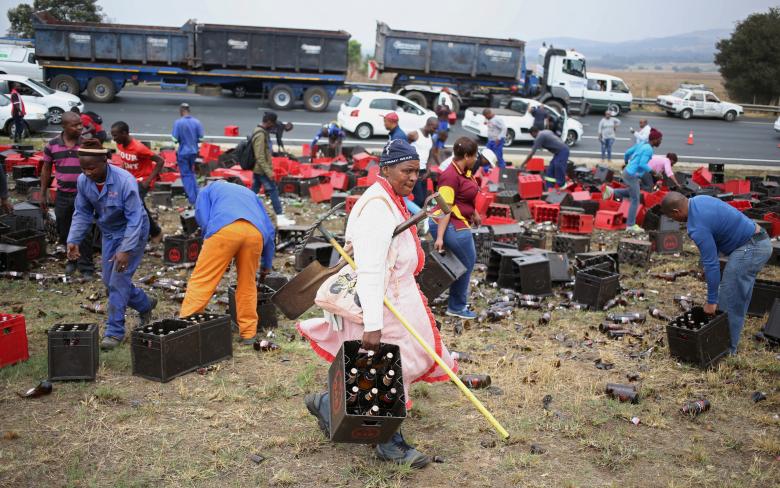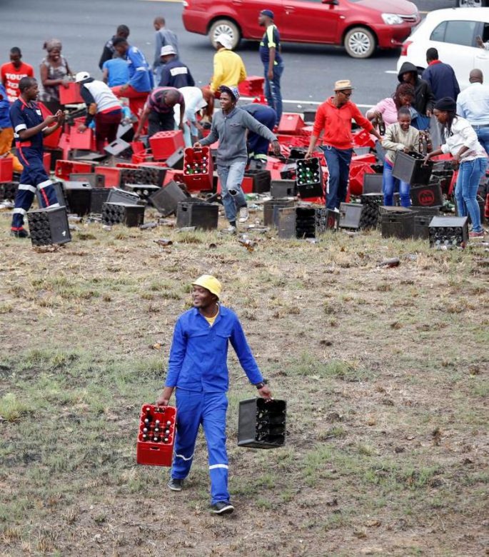 На загородной трассе недалеко от Йоханнесбурга потерял управление и вылетел с трассы грузовик, перевозивший пиво. Ящики с пивом выпали из фуры и рассыпались возле дороги. Местные жители и проезжающие мимо водители не упустили возможность набрать пивка на халяву.
