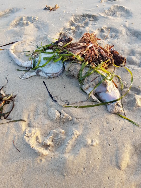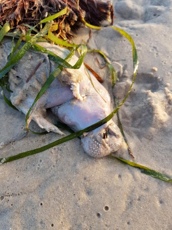 В Южной Австралии во время прогулки по пляжу две собаки обнаружили на песке странное существо. По словам хозяек собак, неведомую тварь вынесло на берег после сильных дождей. Австралийки сделали фото трупа и оставили его на берегу, побрезговав прикасаться.